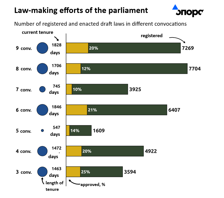The main task of MPs is to develop legislation, not, for example, to repair roads or install playgrounds. Many parliament members take this function quite literally and register hundreds of bills, either on their own or in co-authorship. On the one hand, this is a way for MPs to fulfill their election programs or promises, but on the other hand, the vast majority of such draft laws will never be adopted or even considered by a relevant committee. Often (though perhaps not quite correctly), such activity of MPs is called "legislative spam".