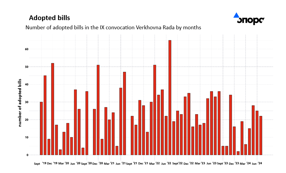 The real legislative "turbo mode" was in effect in July 2022, when the Parliament passed as many as 65 bills. The second most productive month was December 2019, when 52 bills were passed. This is only one more than in March 2022, at the beginning of the full-scale Russian invasion, and in December 2020.