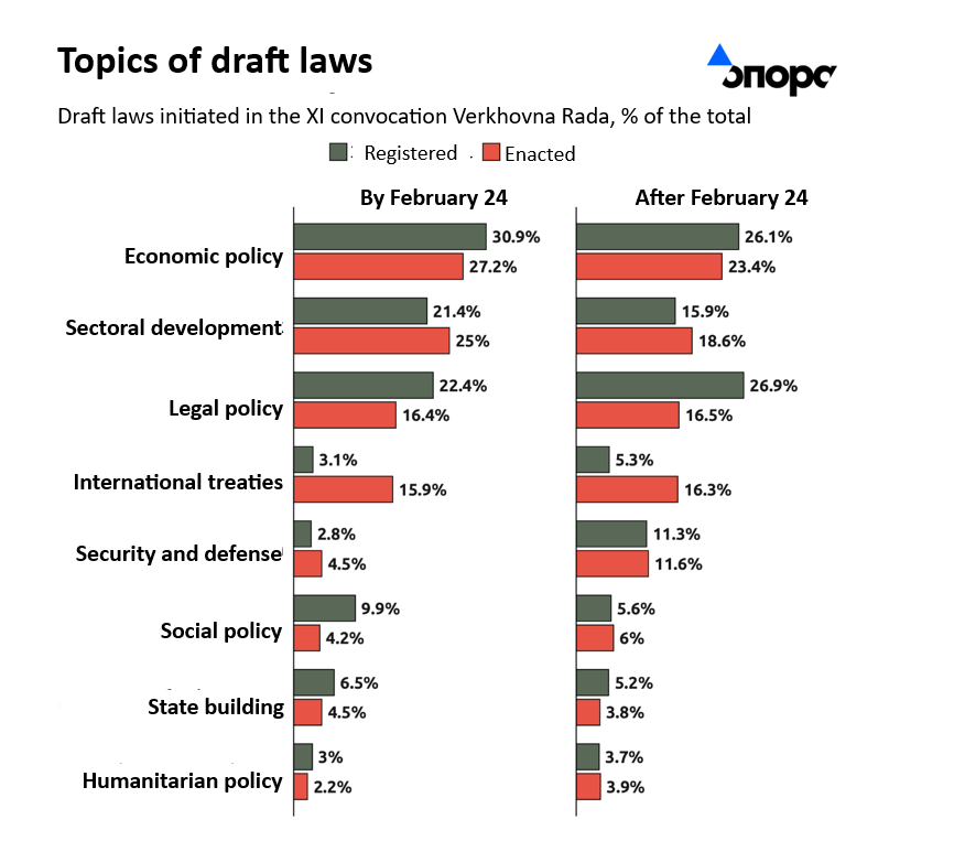 In addition to the active adoption of bills, during the full-scale Russian invasion, changes in the topics of registered and adopted bills can be noted. The classic leading titles have not changed: economic and legal policy, as well as sectoral development.