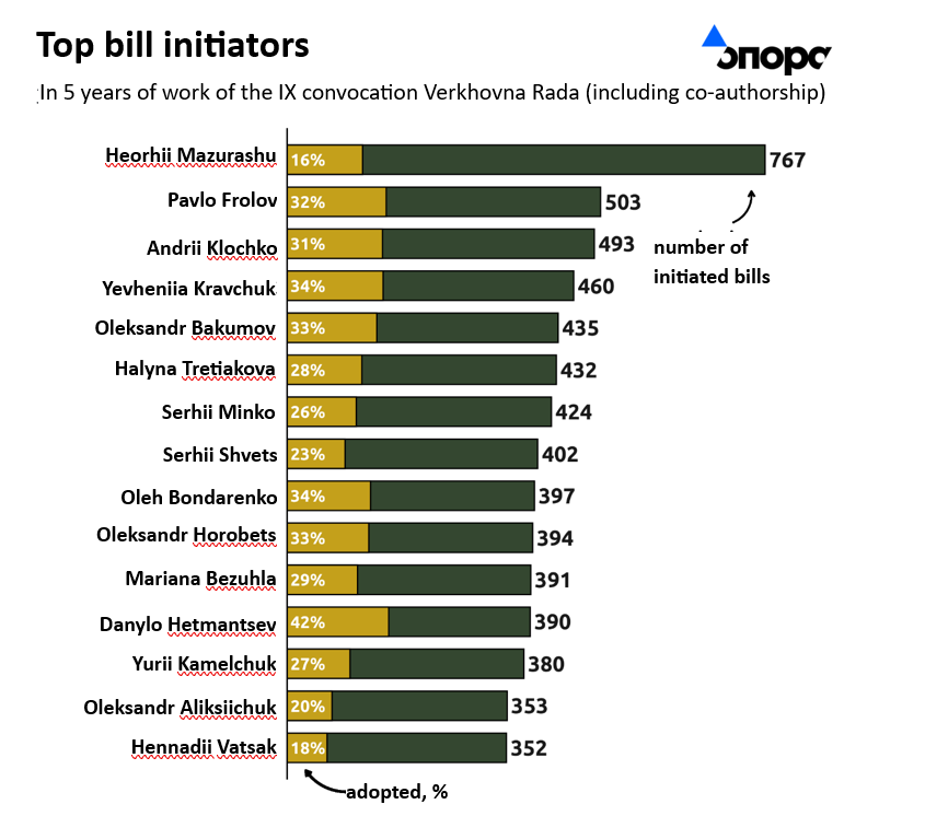 Andrii Klochko (Servant of the People) co-authored 493 bills, Yevheniia Kravchuk (Servant of the People) – 460, Oleksandr Bakumov – 435 (Servant of the People), Halyna Tretiakova (Servant of the People) – 432, and Serhii Minko (Dovira [Trust] group) – 424.