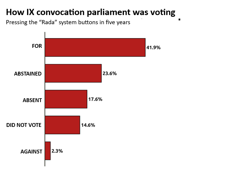In total, over the 5 years of work in the session hall, MPs voted almost 18 thousand times. This means that there were more than 7.5 million clicks on the Rada system buttons in total.