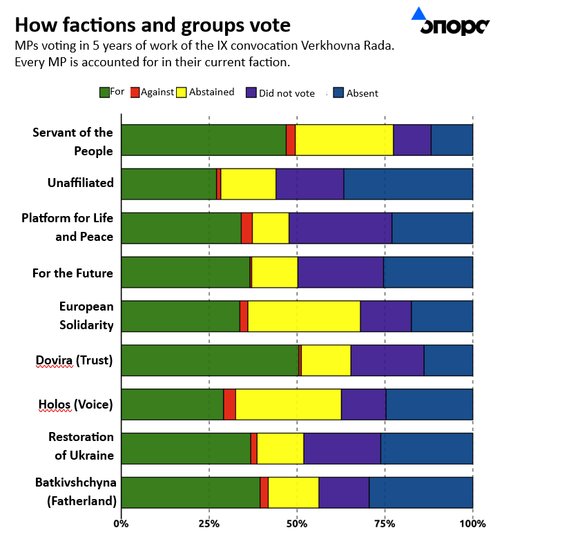 Over the 5 years of the parliament's work, members of the Dovira (Trust) group have been the most active in voting "for"– 50% of instances, and members of the Servant of the People party – 47%. Members of the Holos (Voice) party are the least likely to press the "yes" button – 29%, and non-factional members – 27% respectively.