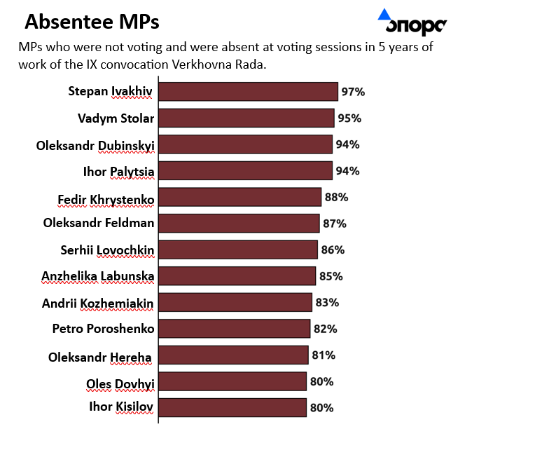 The leaders in terms of the number of missed voting sessions are Stepan Ivakhiv (For the Future group) and Vadym Stolar (currently – the Restoration of Ukraine group), who did not vote and/or were absent in 97% and 95% of cases respectively. The third and fourth places are occupied by Oleksandr Dubinskyi, a non-factional member of the party, and Ihor Palytsia, a member of the For the Future group, who had 93% of absences. Fedir Khrystenko (unaffiliated) rounds out the top five anti-leaders in terms of attendance.