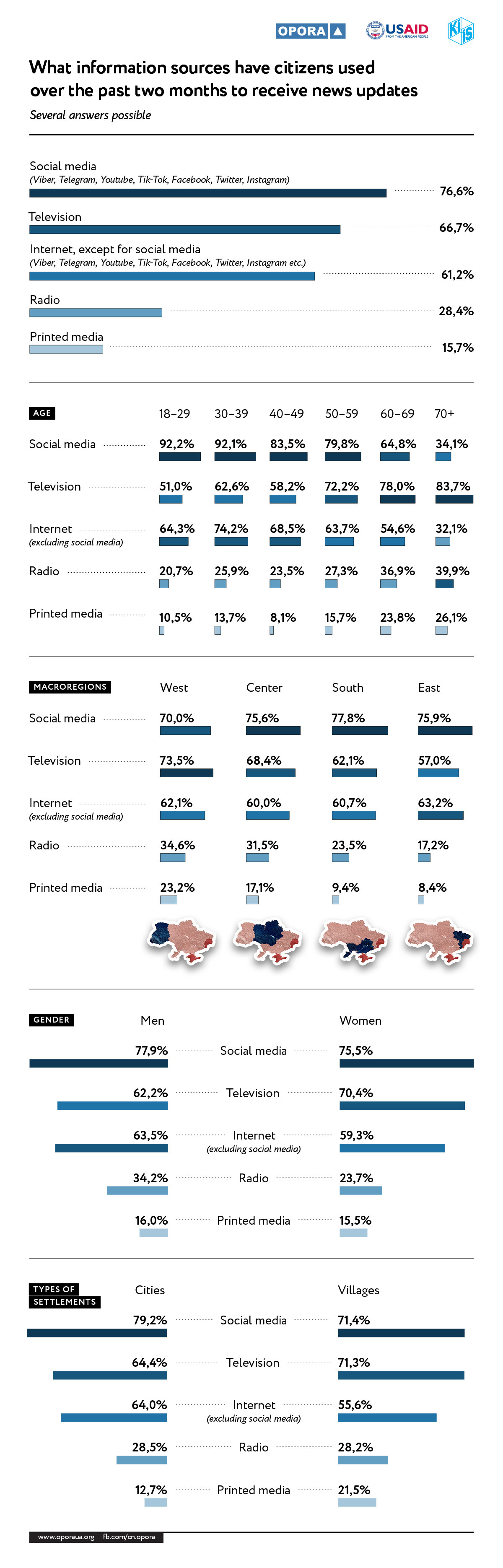 The most popular source of information in the last two months was social networks — 76.6% of Ukrainians use them to get news updates. The second most popular source was television, with 66.7% of votes, the third place went to the Internet (not including social networks) — 61.2% of users. Currently, about 28.4% of Ukrainian citizens listen to the radio, and only 15.7% of respondents read the printed media.