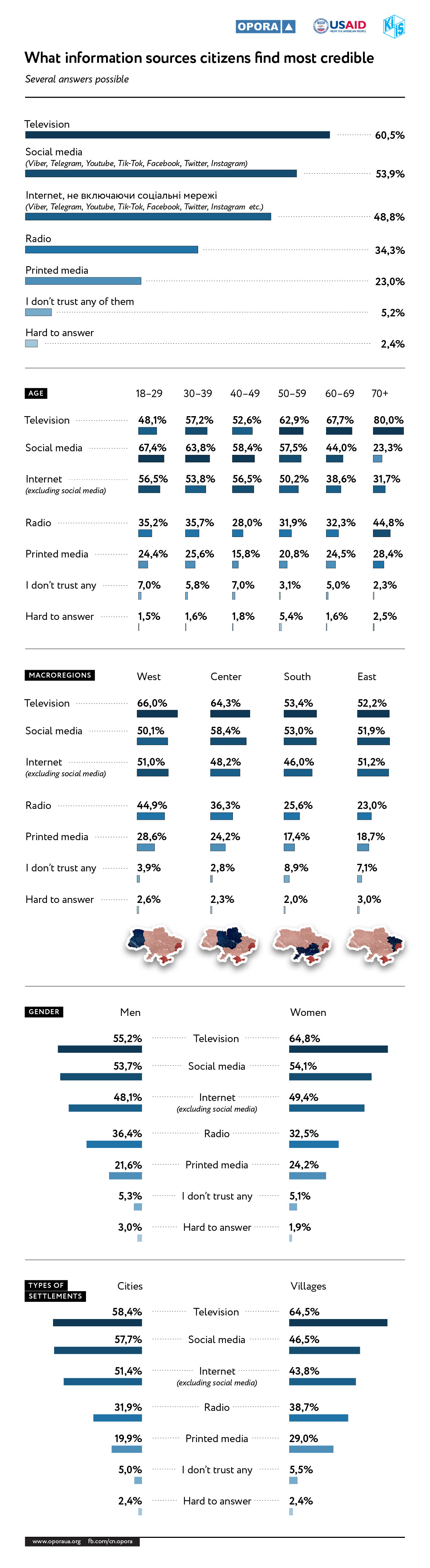 The next question we asked the respondents is about the information sources they trust as regards the credibility of the news. The findings showed that Ukrainians have the greatest confidence in television (60.5%), social networks (almost 54% of respondents), and the Internet (in addition to social media) (almost 49%). A little less trust has been shown by Ukrainians for radio (34%) and printed media (23%). About 5% of respondents do not trust any of the information sources.