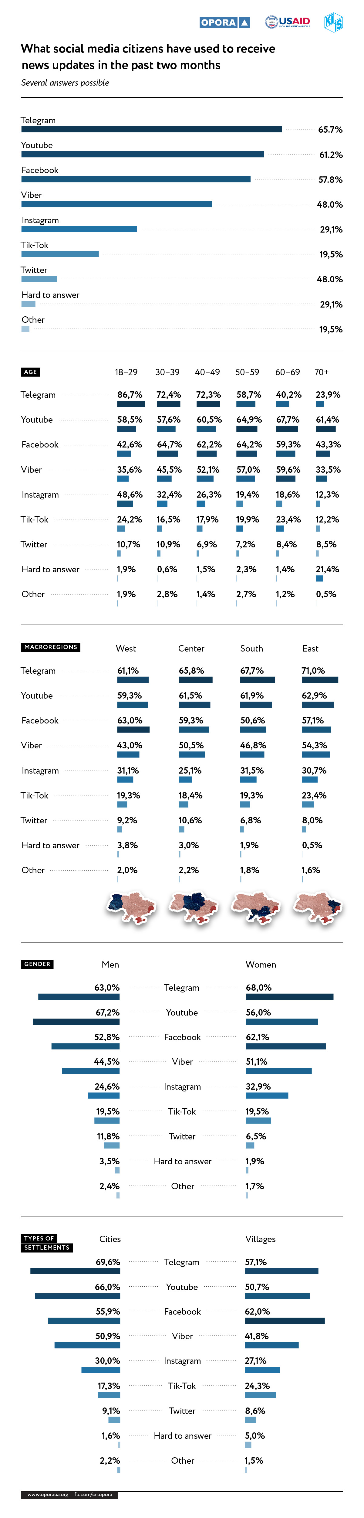 Most respondents used Telegram (65.7%), YouTube (61.2%) and Facebook (57.8%) to receive news in the last two months. 48% of respondents used Viber, 29.1% — Instagram, 19.5% — TikTok, 8.9% — Twitter. About 2% of respondents used other social media (WhatsApp, Signal, etc.) to receive news updates.
