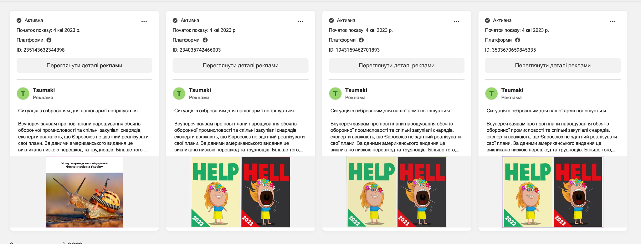 Let's start with the post that first caught our eye and prompted us to explore the Political Ads Library in more detail. It is an ad for the newly created Tsumaki page that promotes the classic statements of Russian propaganda. However, they are in Ukrainian. Previously, similar publications were also captured by the Center for Information Security and Strategic Communications.