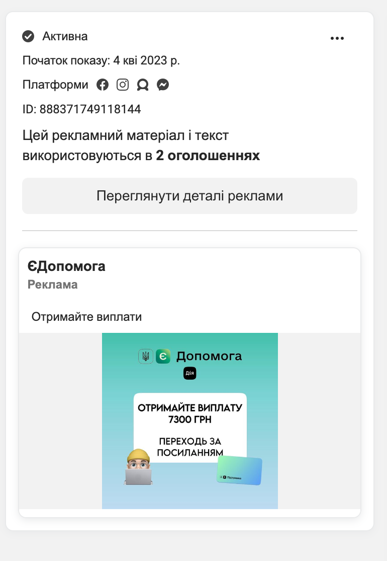 We identified several dozen similar messages from different pages advertising the financial assistance options, imitating the design and name of the “Diia” app, or the state aid program “eSupport”.