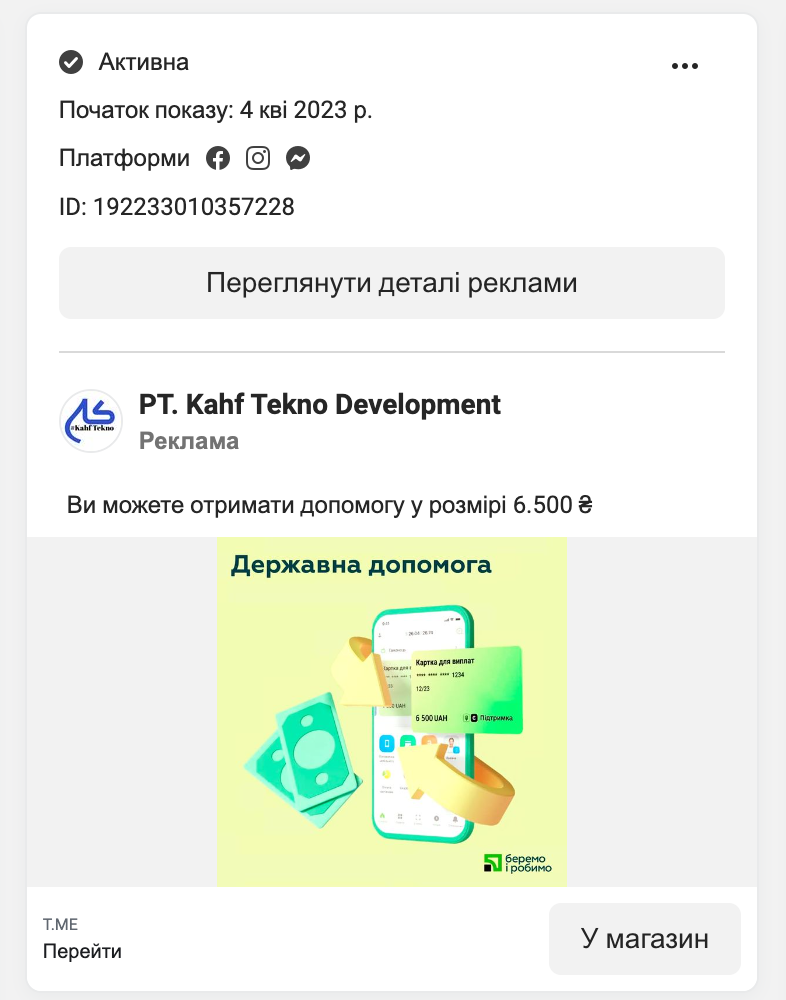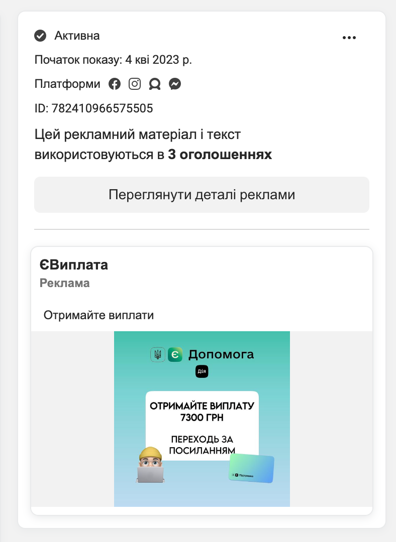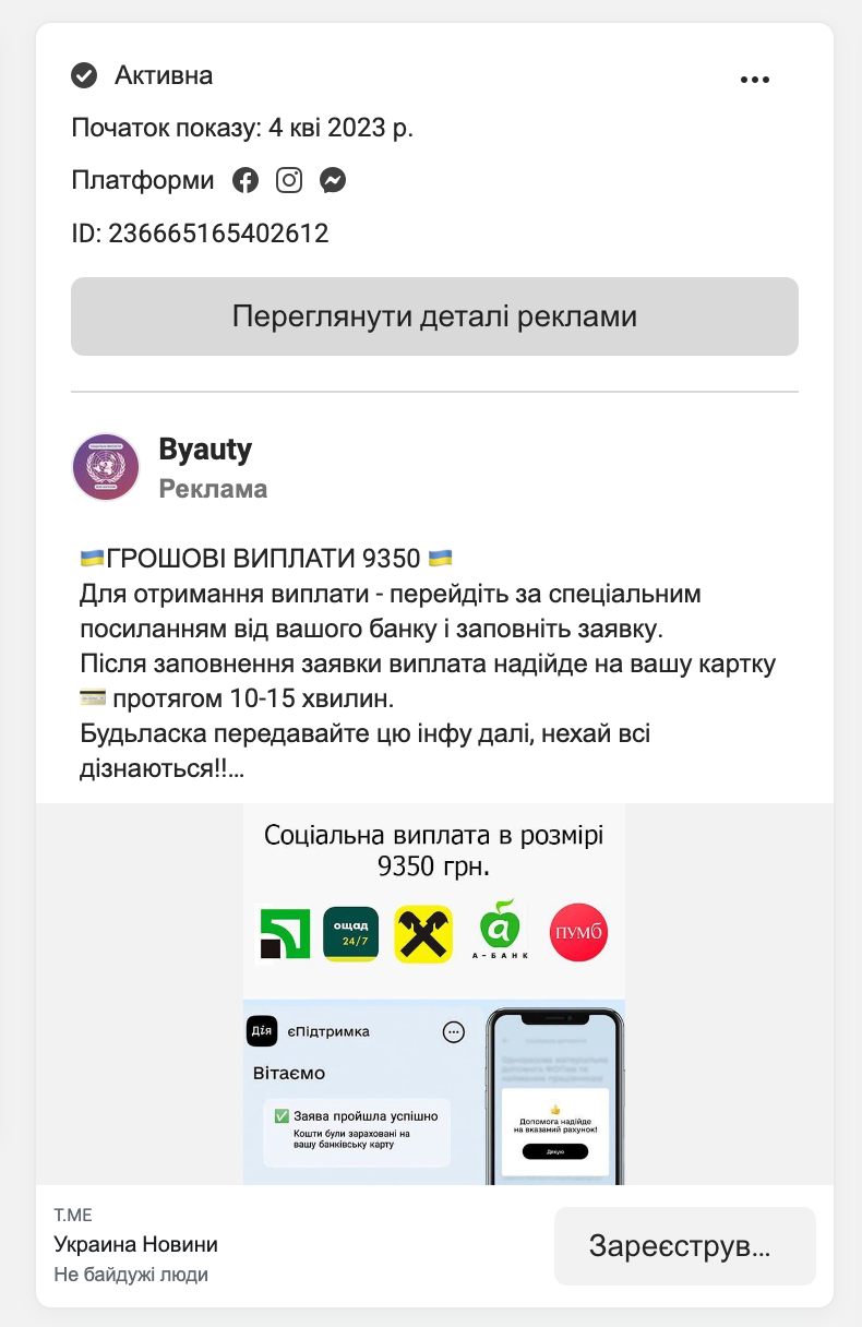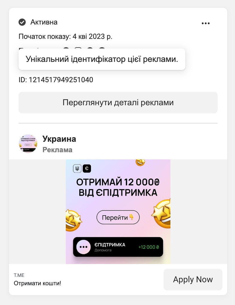 Judging by the number of views of posts in the Telegram channels, thousands of Ukrainians fall for fraudulent resources every day with the help of Facebook ads. Although the ad texts often use the words "payments," "funds," "money" and the names of government programs, Facebook algorithms for ad verification do not identify them as fraudulent content. At the same time, the policy of the social network has separate rules for advertising financial services and loans, as well as for political ads.