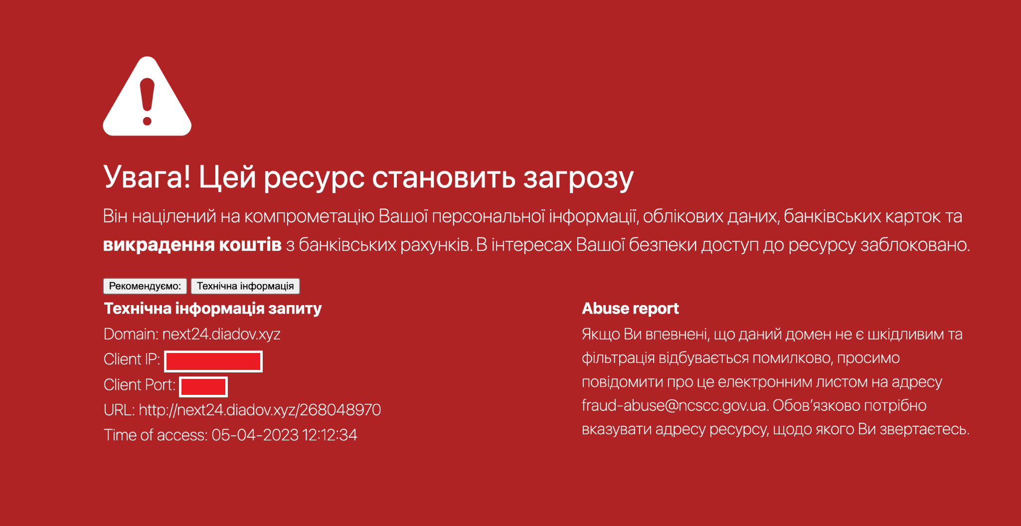 All ads redirect you to Telegram channels that publish links to phishing sites imitating the web pages of the largest Ukrainian banks. While some of these websites have been blocked by the National Cybersecurity Coordination Center, others remain active. When the website is blocked, the user will receive a warning and cannot go directly to the page.