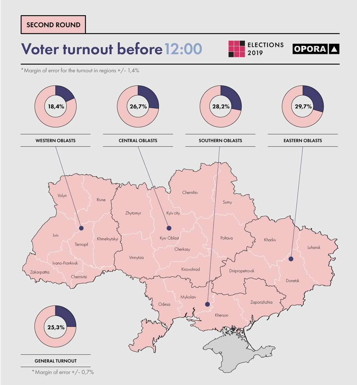 According to the data from OPORA’s observers, the voter turnout as of 12:00 on 21 April presidential election in Ukraine in 25.3% with margin of error 0.7%.