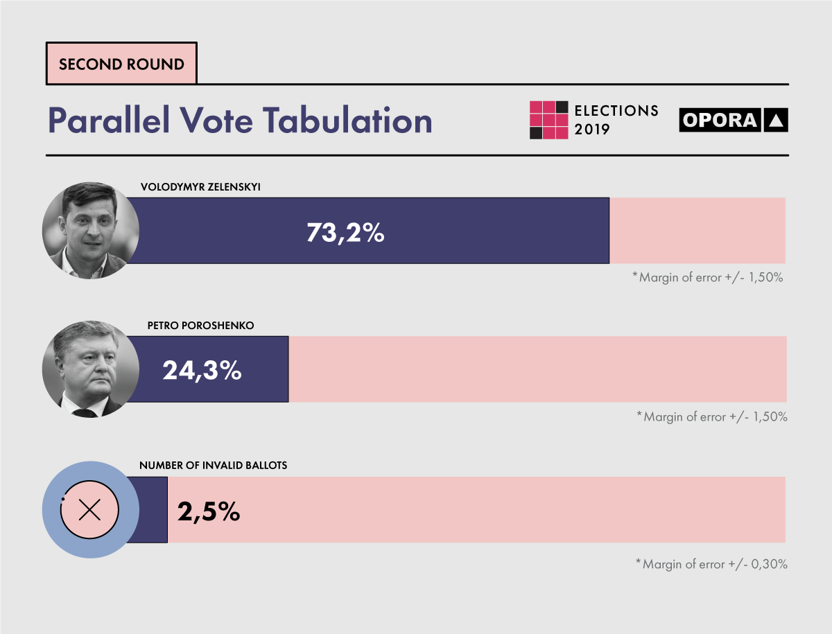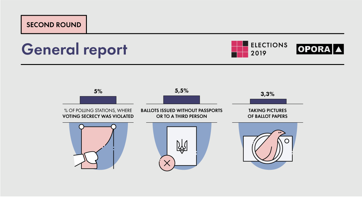 According to estimates of OPORA observers present at polling stations on April, 21, 1% of the stations failed to comply with the legal procedure of the vote count (in the first round, breaking the vote count procedures was registered at 2.2% of polling stations).
