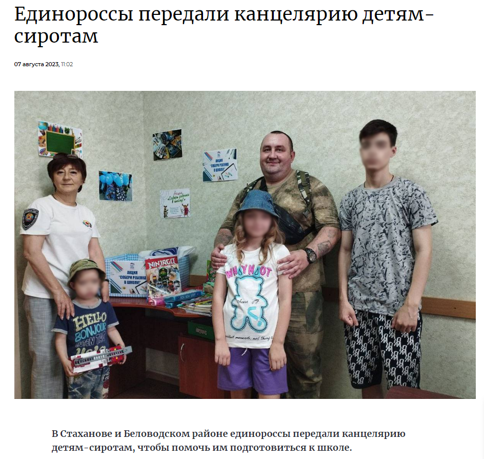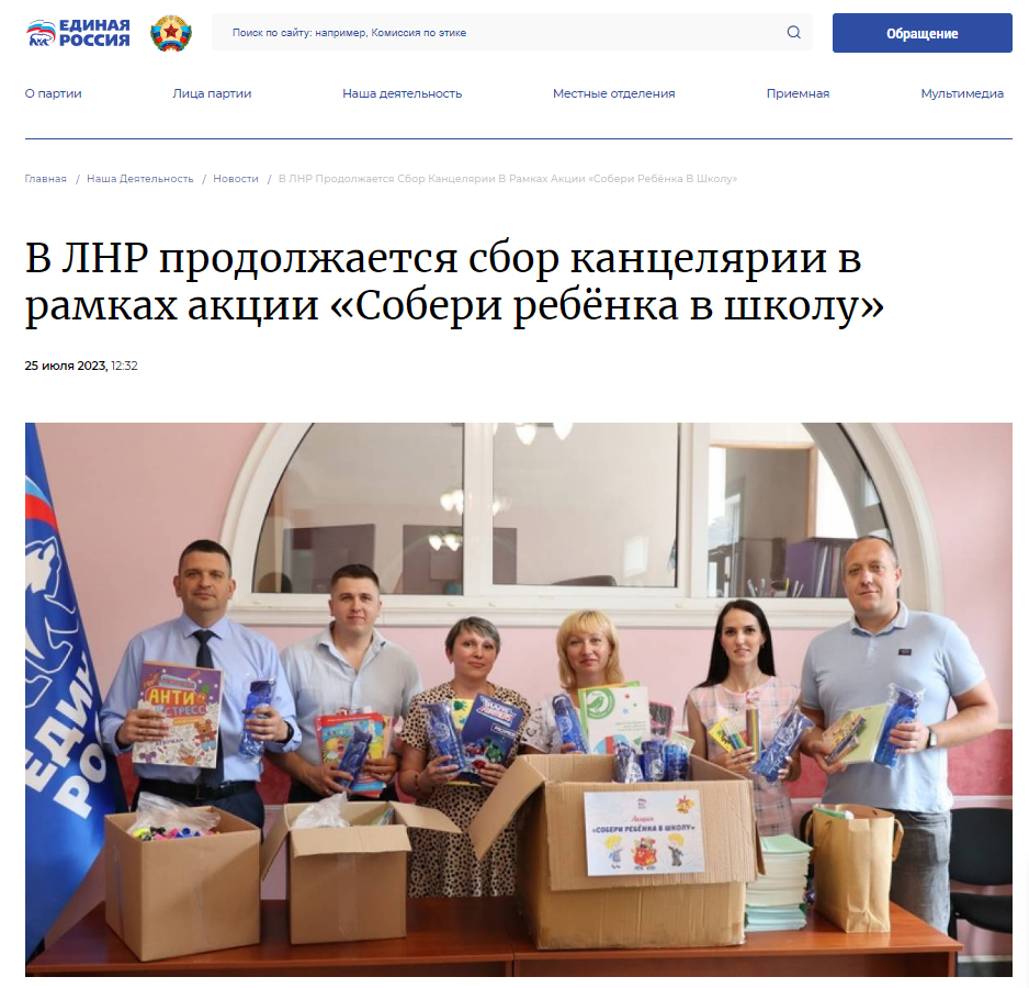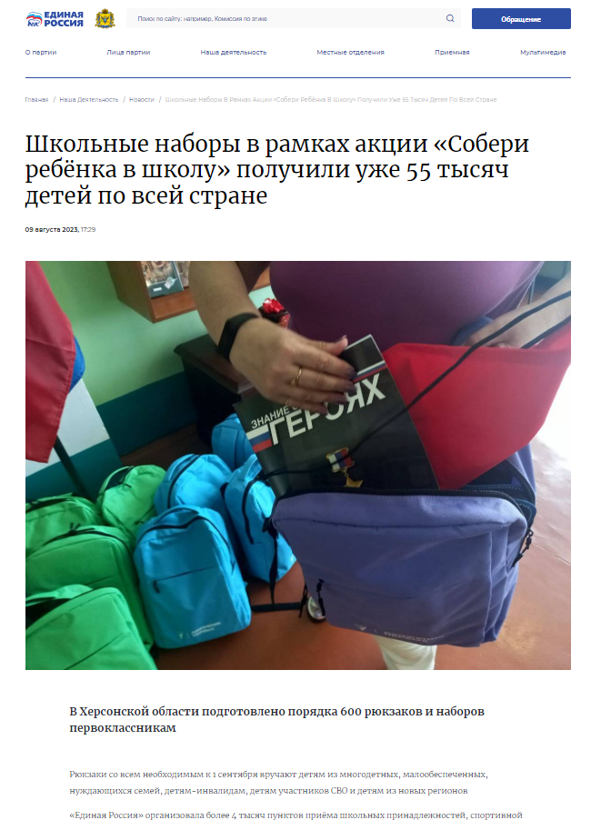 Another area of “care” is the preparation of children for school. It is a common electoral practice for the “United Russia” members to run a campaign “help a child get ready for school.” This way, they use children for promotion. Moreover, the single voting day in Russia falls on the first days of September, which is very convenient. The campaign also covered the occupied territories where the political party handed out schoolbags and stationery, paired with propaganda materials entitled “Knowledge About Heroes.”
