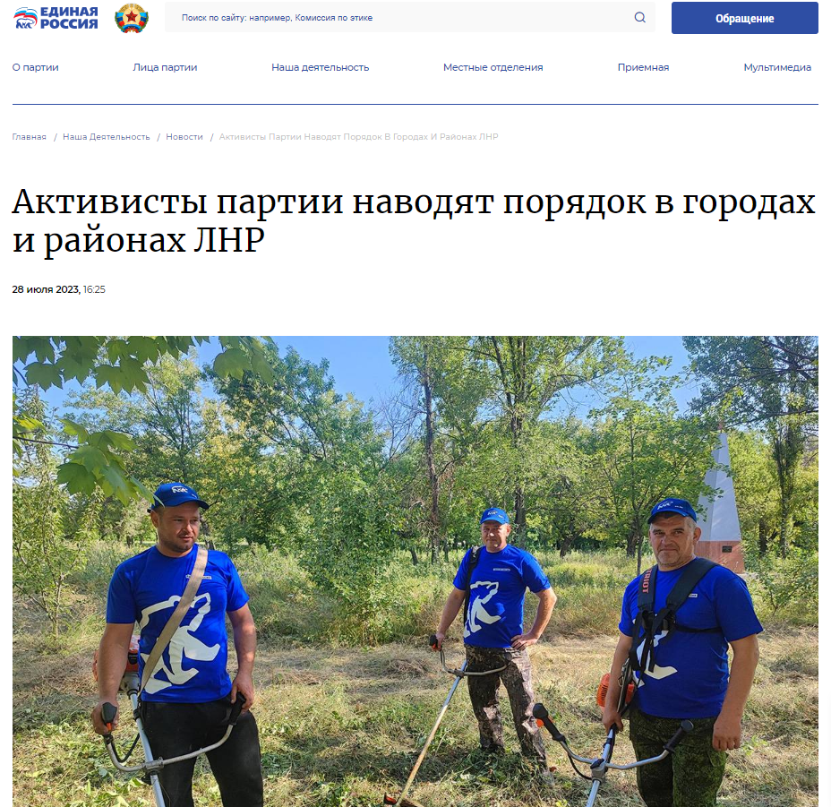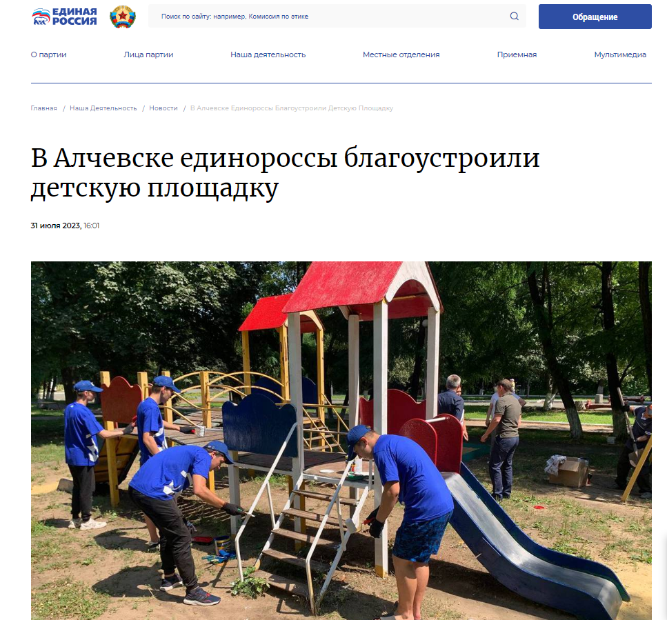 Another interesting element of the “electoral campaign” in the occupied territories is the recovery of infrastructure and landscaping. Thus, the “United Russia” members took along the flags and branded T-shirts, and rushed to mow the grass, to install playgrounds, to repair house roofs, social facilities, a.o.