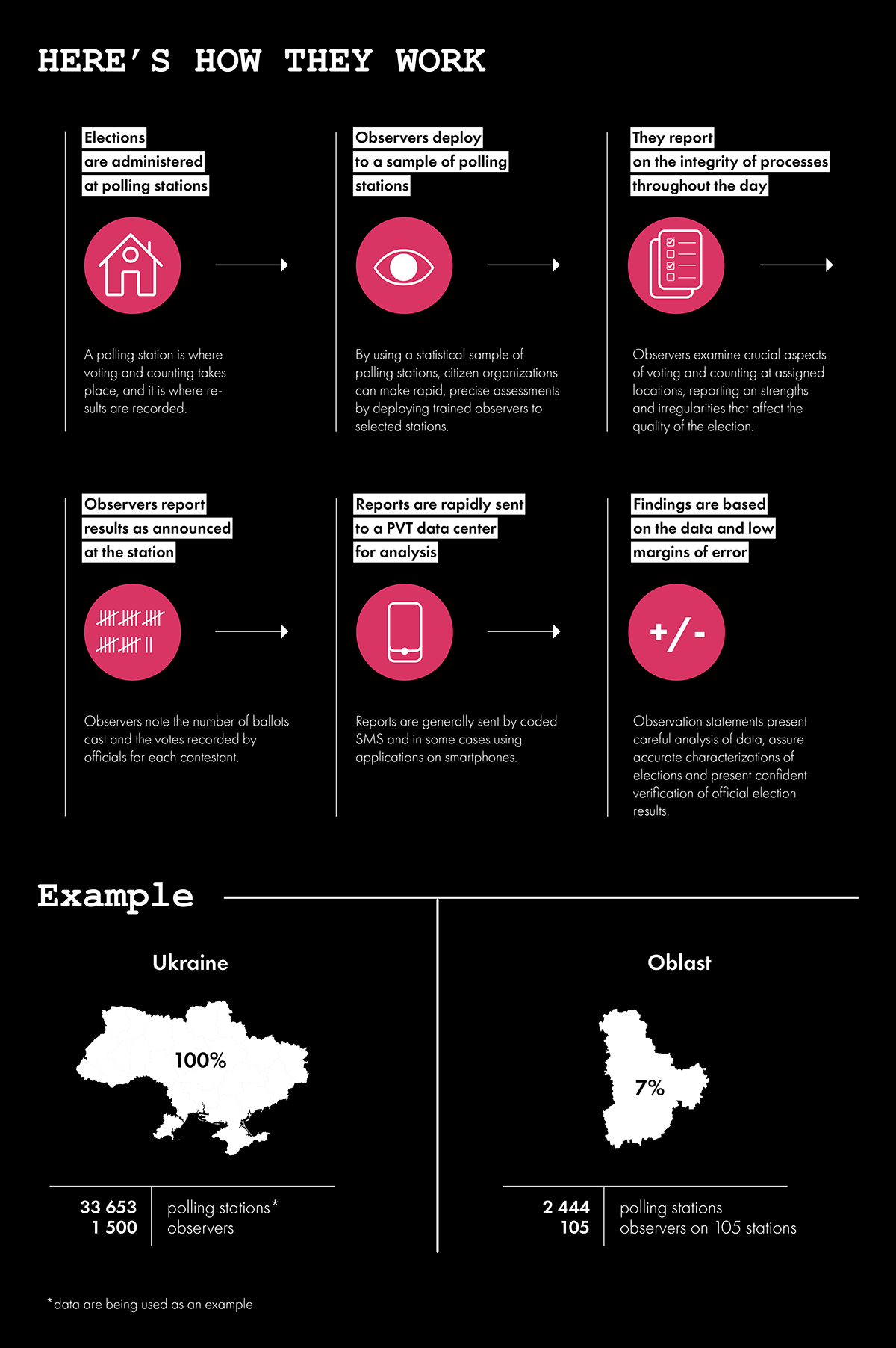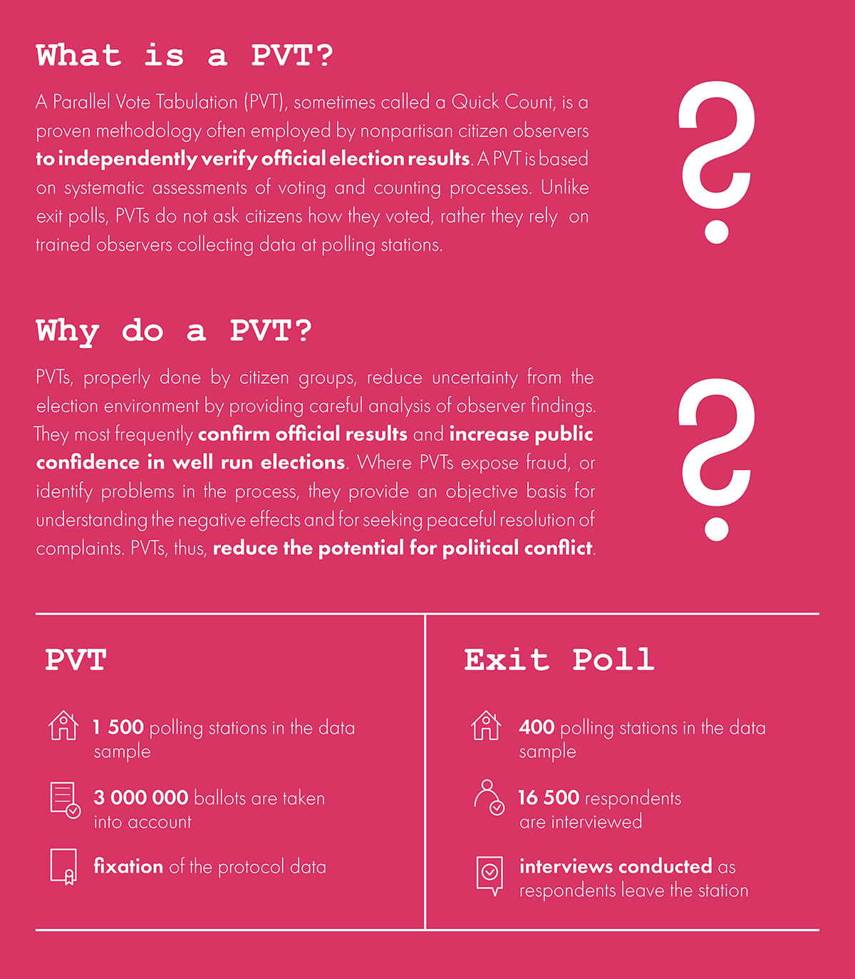 PVT allows to determine whether a vote count accurately reflects election outcomes and realize observation of a voting process during the day to detect any significant irregularities.
