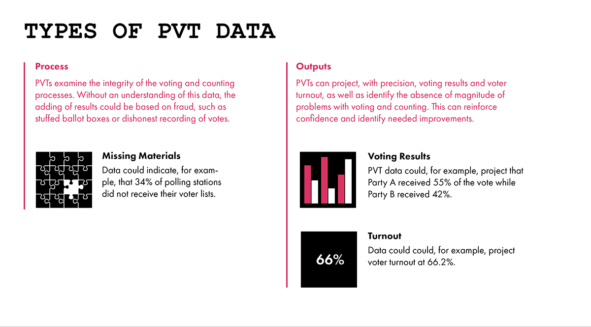 PVTs can guarantee a prompt analysis of the election process based on primary data reported by observers. A PVT can confirm the official results and increase confidence in a well-run election. A PVT can also expose fraud, or identify problems in the process and assess the impact such problems may have on the outcome of the election. Thus, PVTs reduce the potential for political conflict.