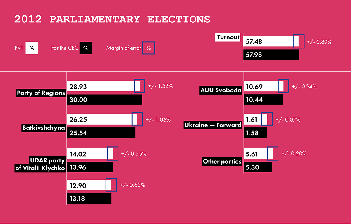 Civil Network OPORA is a non-governmental, non-partisan and financially independent nationwide network of public activists that was formed in 2006. OPORA used PVT for both rounds of 2010 presidential election, 2012 parliamentary elections, 2013 repeated parliamentary elections, and this year's early presidential election.