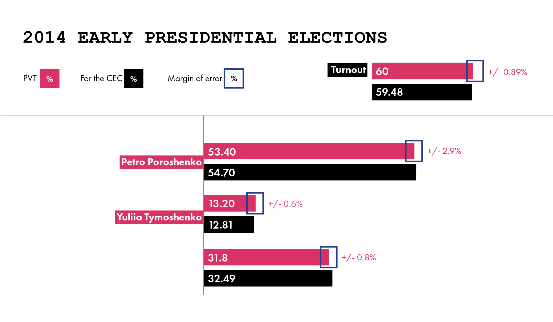 During the presidential election in May 2014, a total of 861,148 Ukrainians cast their ballots at 1,500 sampled PVT polling stations monitored by the PVT. The margin of error for Yulia Tymoshenko was +/-0.6 % and so, the range predicted by the PVT was 12.6 % to 13.8 %. The official result, announced by the CEC was within the range of PVT – 12.8 %. However, the largest sampling for exit polls conducted in the last election was 17,000 voters in 400 stations. Thus, any exit poll is less precise than a PVT.