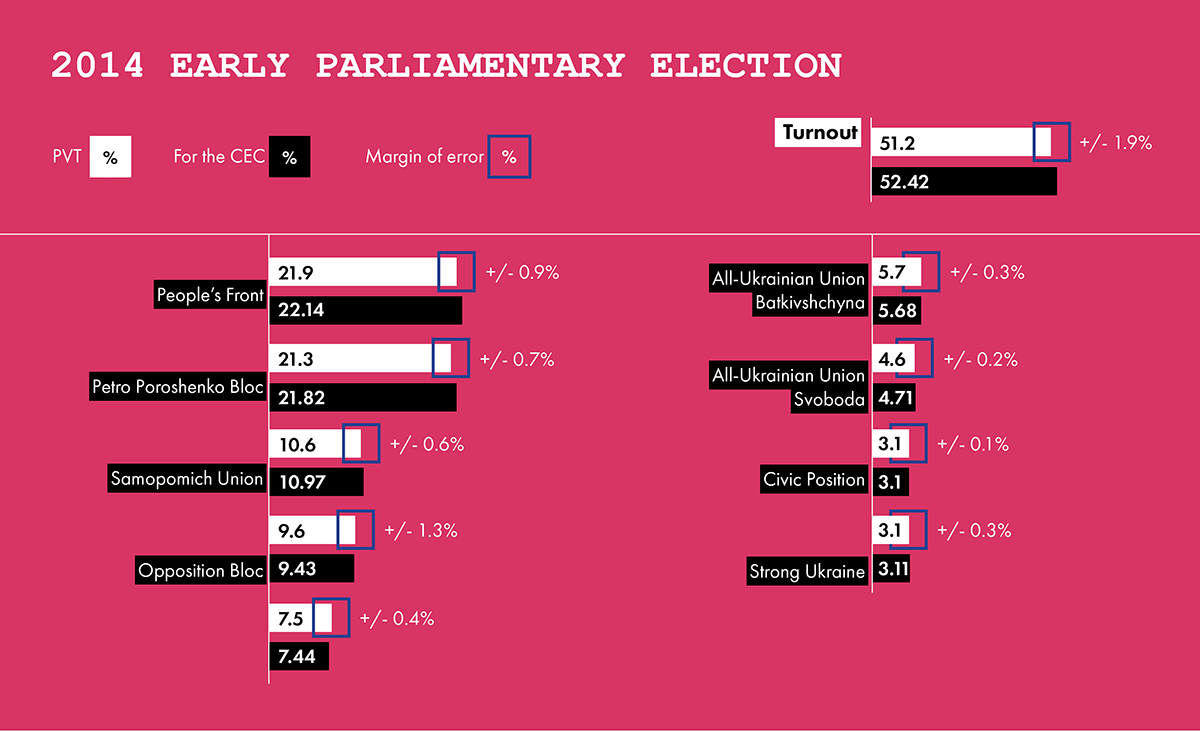 OPORA was the only organization which had predicted the winner by party list in 2014 early parliamentary elections in Ukraine – the People's Front party (proved by the official data of the CEC), while the Petro Poroshenko Bloc was winning according to the results of all exit-polls. Besides that, only OPORA's PVT results predicted that the AUU Svoboda is not going to be represented in the newly-elected Parliament.
