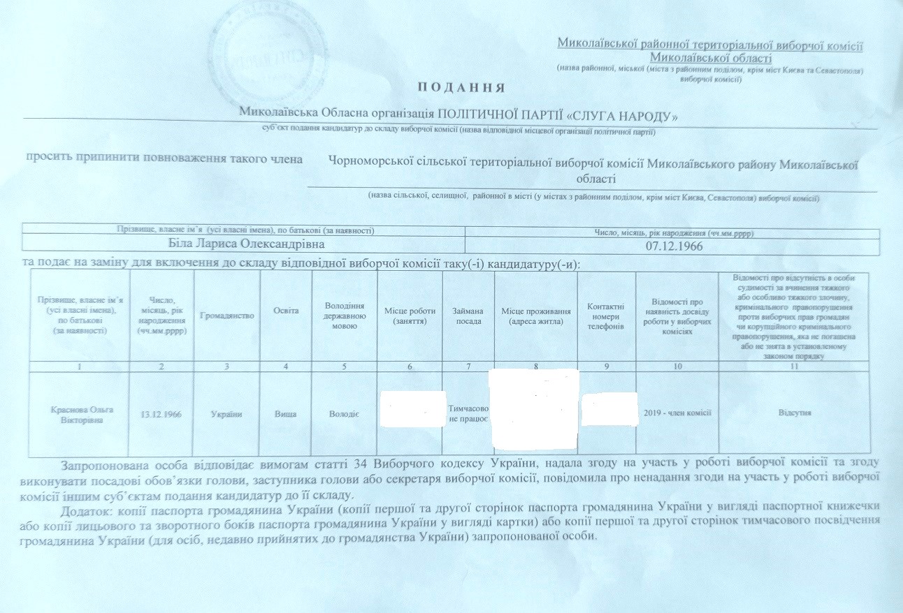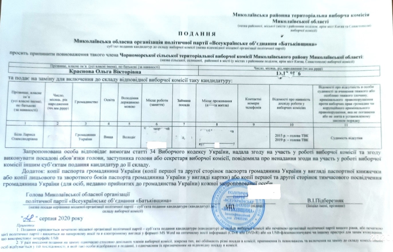 Thus, the first submission was signed by the head of the oblast branch of the party Vadym Pidberezniak, and sealed with the party stamp. It arrived to the TEC on August, 28. The commission members found that the submission from “Batkivshchyna” suggested excluding Olha Krasnova from the membership, and including Larysa Bila instead. However, the latter is already the commission member from the “Servant of the People”, and the party has not withdrawn her from the commission membership. According to the Protocol No 2 on the establishment of village and township commissions of Mykolayiv district and the Appendix No 15 of the Resolution, Olha Krasnova is the head of Chornomorske village election commission from the AU “Batkivshchyna,” and Larysa Bila is the commission member from the “Servant of the People” party.