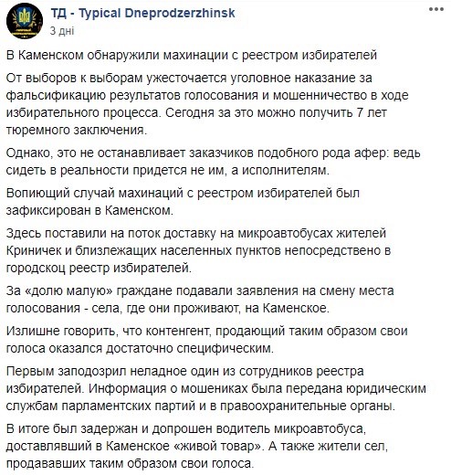 On September 5, Facebook community "Typical Dniprodzerzhynsk" published a post about possible fraud with citizens changing their election addresses. Allegedly, residents of close villages are being brought to the State Register of Voters in Kamianske so that they can change their electoral address and vote in the city.