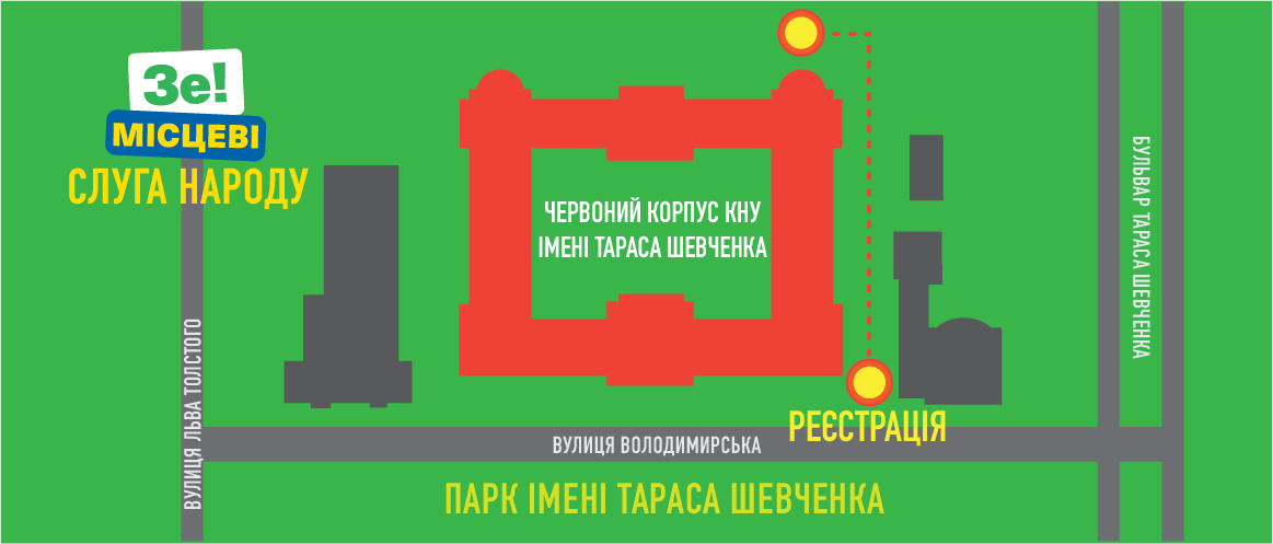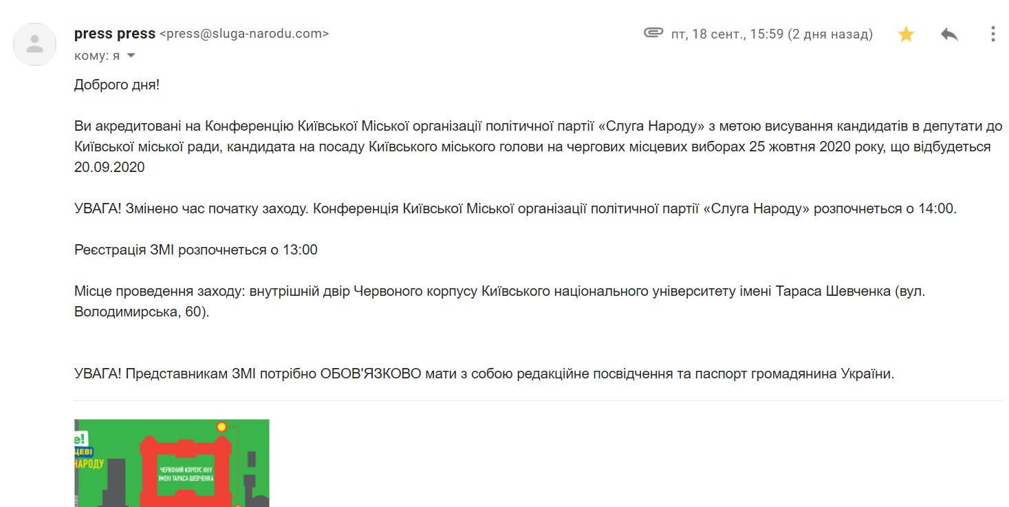 On Sunday, 20 September, Kyiv city cell of the Servant of the People political party was supposed hold a conference, dedicated to nomination of candidates for members of Kyiv City Council and Kyiv mayor in the 25 October 2020 local elections. Such date, time and place were indicated in the letter sent by the press service of the Servant of the People political party to confirm the accreditation of a journalist at Tochka OPORY. Tochka OPORY's journalist received the letter on 18 September at 3:59 PM. The letter was about changing the time of event to 2:00 PM. It was indicated in the letter, that the event would be held in the courtyard of the Red Building of the Taras Shevchenko National University of Kyiv ( 60 Volodymyrska Str.).