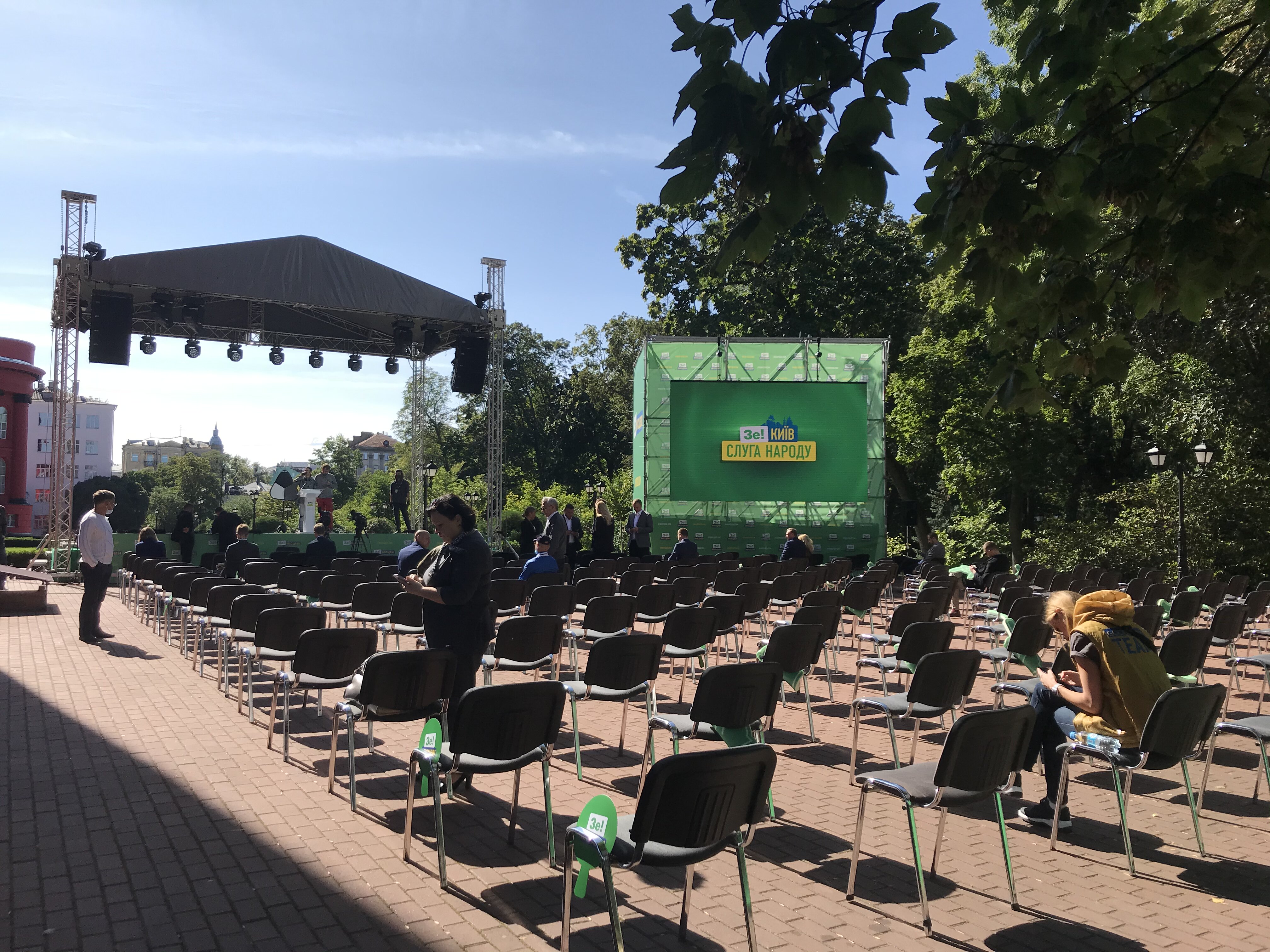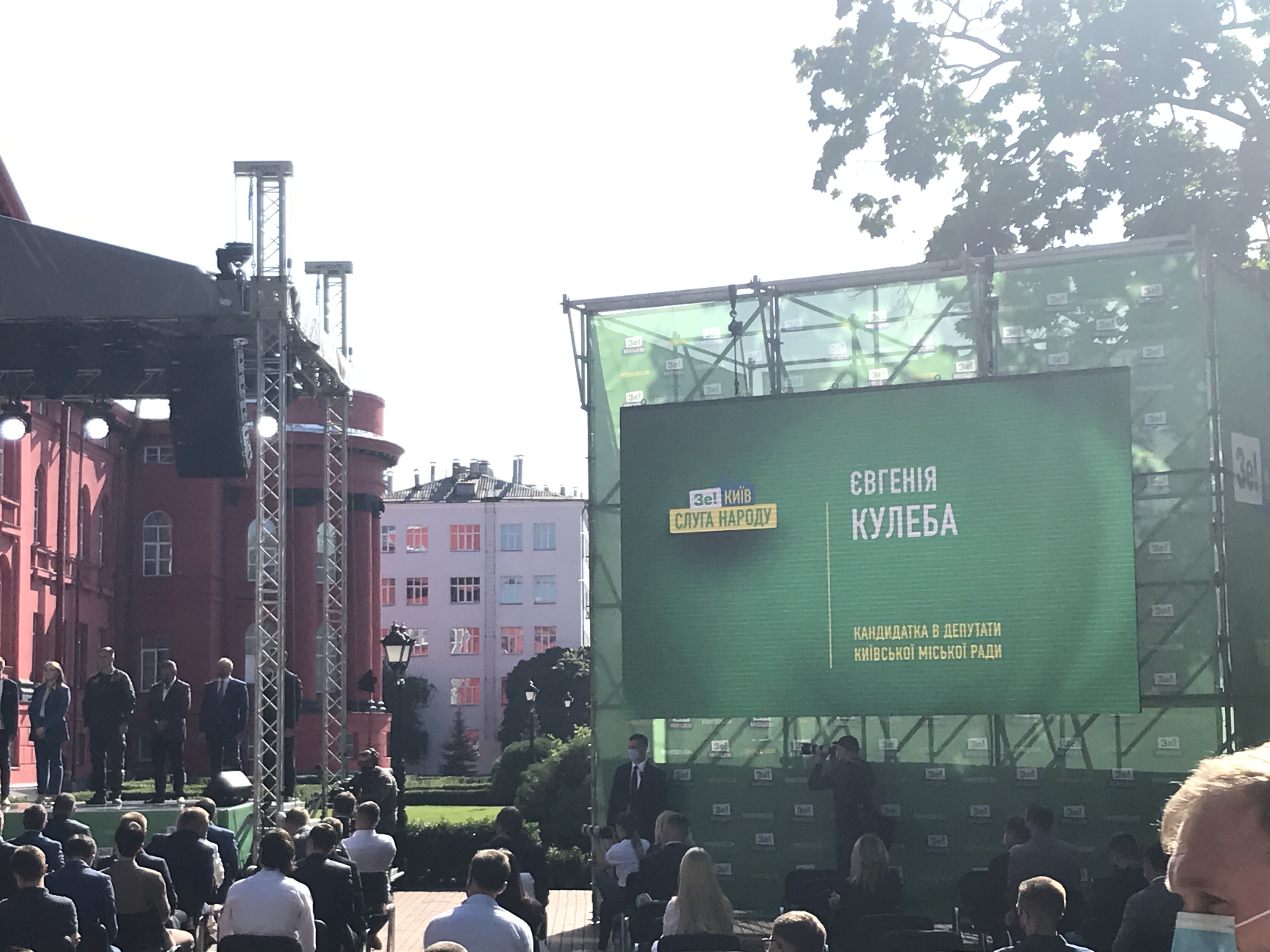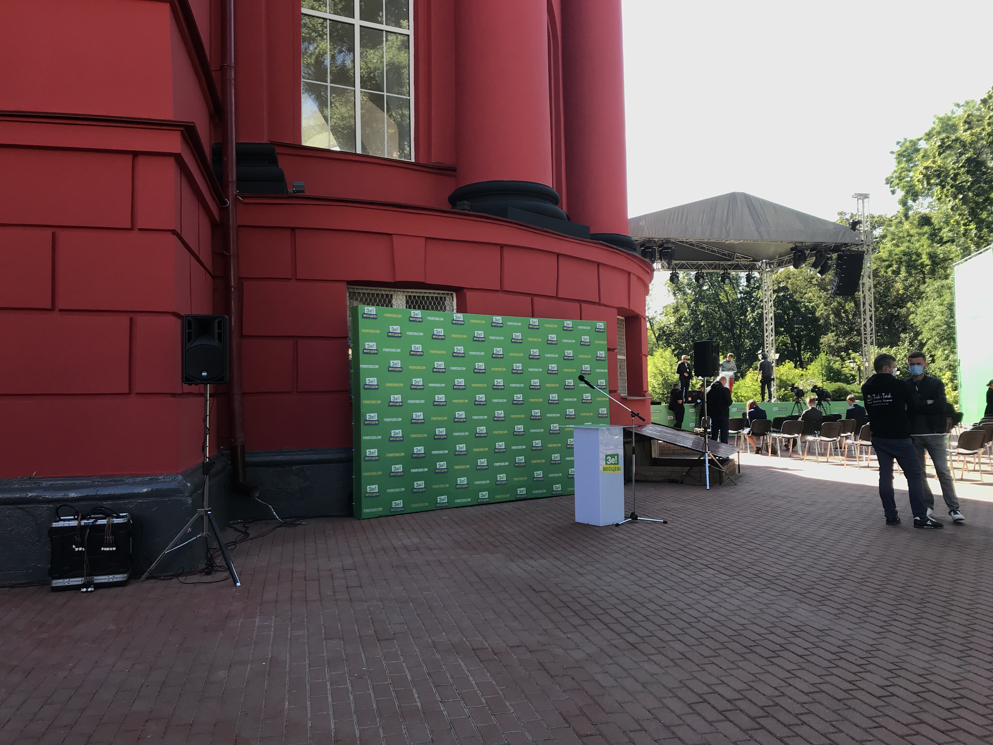 The event had really taken place in the courtyard of the Red Building of the Taras Shevchenko National University of Kyiv. There was a stage with banners “Ze!local”, “vybory2020.com”, a rostrum holding banner “Ze! Servant of the People” in the colors of the Servant of the People party and a screen “Ze!Servant of the People".