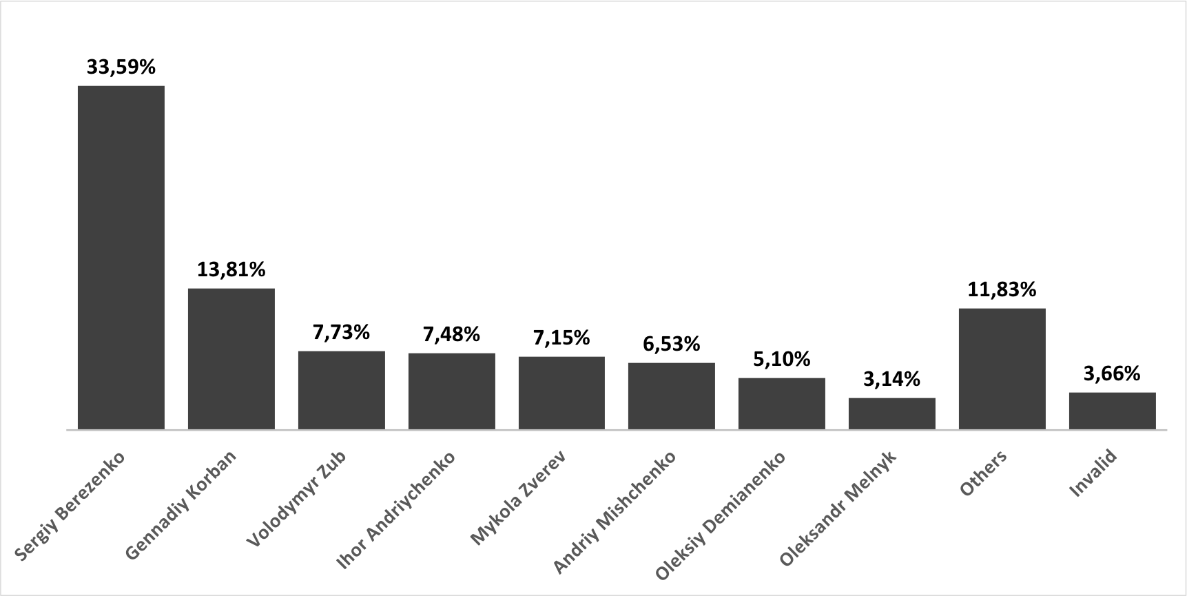 According to the parallel vote tabulation conducted by OPORA on the basis of PEC preliminary protocols on vote count at polls, candidate SERHII BEREZENKO, nominated by the Solidarity Petro Poroshenko Block political party, has won with 33.59% of votes. HENNADII KORBAN, nominated by the Ukrainian Union of Patriots – UKROP party, is on the second place with 13.81% of votes. The third place with 7.73% of votes, according to the results of parallel vote tabulation, was taken by VOLODYMYR ZUB, supported by the Samopomich Union party. IHOR ANDRIICHENKO (Democratic Alliance) has received 7.48% of votes. Self-nominated candidate MYKOLA ZVIERIEV was supported by 7.15% of voters. 6.53% of voters gave their votes to ANDRII MISHCHENKO, nominated by the AUU Svoboda.