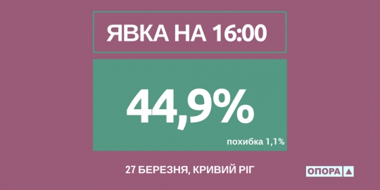 As of 4:00 PM, voter turnout in in early election of Kryvyi Rih city mayor reached 44.9% (margin of error 1.1%). To compare, the voter turnout in 15 November 2016 regular election of Kryvyi Rih city mayor was 28% as of 4:00 PM.