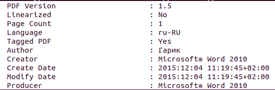 The file contains several images, including the state emblem, a handwritten signature and dates. Metadata of images show that original image files on the user's computer were named in Russian.