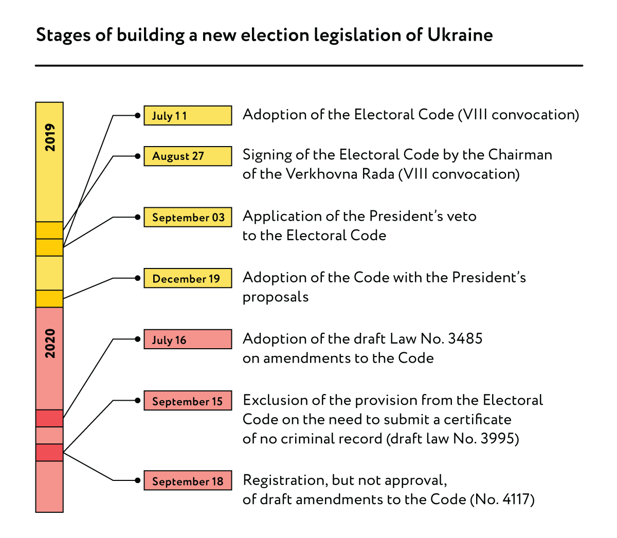 The technical errors and inaccuracies identified after the amendments to the Electoral Code, as well as the need to regulate voting during the pandemic, resulted in the registration of a new draft law by Rada deputies. It was offered to the parliament after the start of the local election process (No. 4117). These changes to the Electoral Code were not approved, which negatively affected the regulatory framework for the conduct of elections during the pandemic and forced the CEC to independently regulate certain election procedures on an ad hoc basis. A significant challenge for 2020 local elections came from the incomplete legislative regulation of the new administrative-territorial system, as well as the failure to amend the Constitution of Ukraine on relevant matters of decentralization.