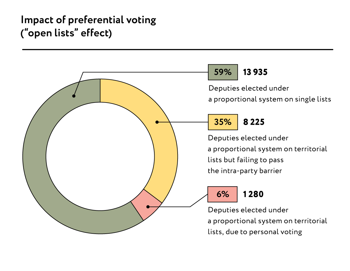 The legal regulation of the distribution of seats in local elections under the proportional electoral system with open lists has provoked robust political and expert discussion. First of all, there is debate about having a guaranteed mandate for the top person on the electoral list of a party. As noted above, the first person on the list was not assigned to any of the territorial lists of the party organization. Second, the Electoral Code set a requirement for candidates to overcome the 25% internal threshold for candidates on territorial lists, as a share from the electoral quota, to advance to the top of the territorial list. Those candidates who did not overcome the relevant barrier were placed on those lists in accordance with the order determined by the parties. Thus, the new electoral system limited the influence of voting (as opposed to party decisions) on the promotion of candidates on the electoral rolls. In particular, the effect of closed lists could be exacerbated if voters chose not to vote for specific candidates or if votes were scattered among many candidates on the territorial list. In this report, we analyze in detail the effects of electoral systems, and the study partially confirmed the relevance of previous objections made during the adoption of the Electoral Code.