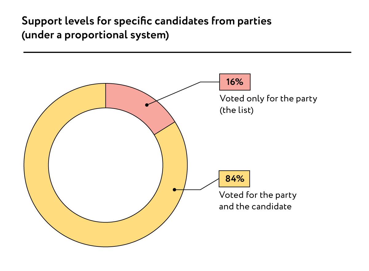 The electoral system adopted for 2020 also proved to be effective in allowing voters to vote for specific candidates from political parties. Thus, 84% of voters opted to cast a vote for a specific candidate on the party lists. We can see that concerns that voters would not cast these votes on a merely voluntary basis proved unfounded, since only 16% of voters voted exclusively for party lists without showing any preferences for candidates represented on them.