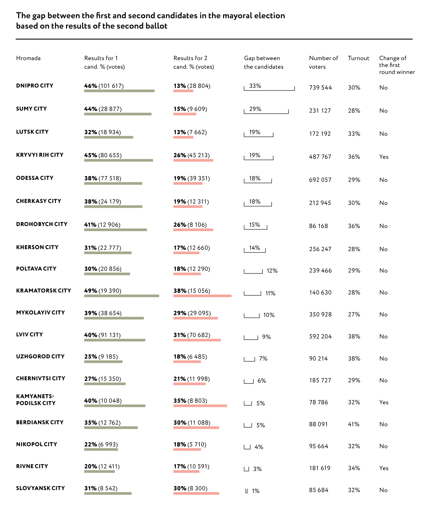 It is worth recalling that while changes to the Electoral Code were being considered, there was a proposal not to hold a runoff in cases where the gap between the first- and second-place finishers was over 20%. However, whis proposal was ultimately not included in the final version of the Code, even though it turned out that this rule would have avoided second rounds in another two cities. Voting in Dnipro and Sumy yielded first-place leads of 33% and 29%, respectively. In addition, the first-place lead for the Lutsk and Kryvyi Rih mayoral elections was over 19%. In Odesa and Cherkasy, the first-place lead was over 18%. In all cities (except for Kryvyi Rih) where the first-place lead was over 6%, the first-place round one finisher went on to win in the second round.