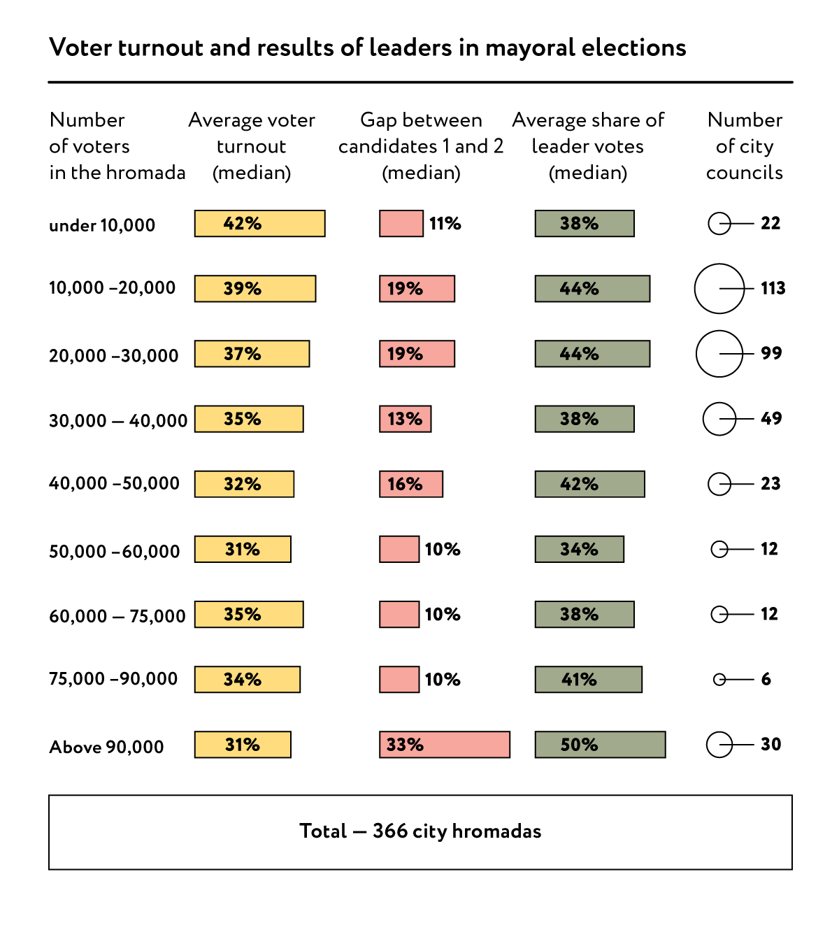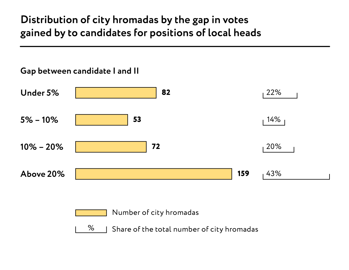 These results show that it may be expedient to revisit the proposed rule which would rule out a second round in the event of a significant (15-20%) gap between the top two first-round finishers. On the other hand, second rounds make particular sense when the round one first-place lead is minimal (5% -10%). In 22% of city hromadas, the winners of the election were candidates who were less than 5% ahead of their main competitors. Given the low voter turnout, these results negatively affect the level of trust in newly-elected heads and the public perception of representative institutions.
