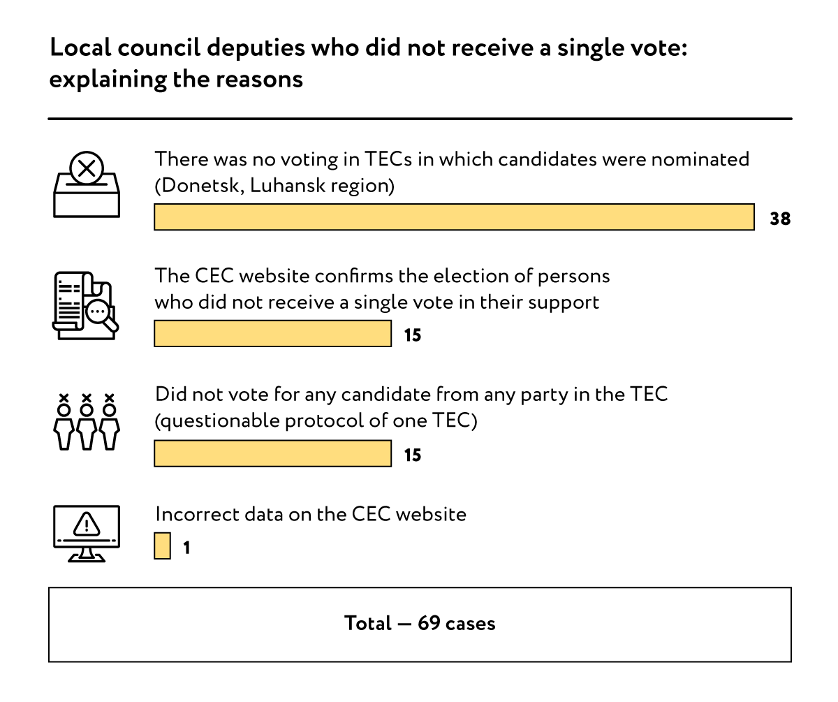 According to the official website of the CEC, in the local elections held under the proportional system, 69 candidates were elected as deputies despite receiving zero personal votes. All deputies were elected from local party organizations in single multi-member constituencies. 38 out of these 69 deputies were elected to Severodonetsk (20) and Shchastya district councils (9) of Luhansk region, and to Volnovakha (7) and Mariupol district councils (2) of Donetsk region. The elected deputies were candidates in territorial constituencies where voting did not take place due to the decision of the CEC on the impossibility of organizing voting. At the same time, the elections of district councils, which include the respective hromadas, were not postponed and party organizations had the right to nominate candidates in constituencies where elections were not held. Thus, candidates from non-voting constituencies received seats in a single multi-member constituency.