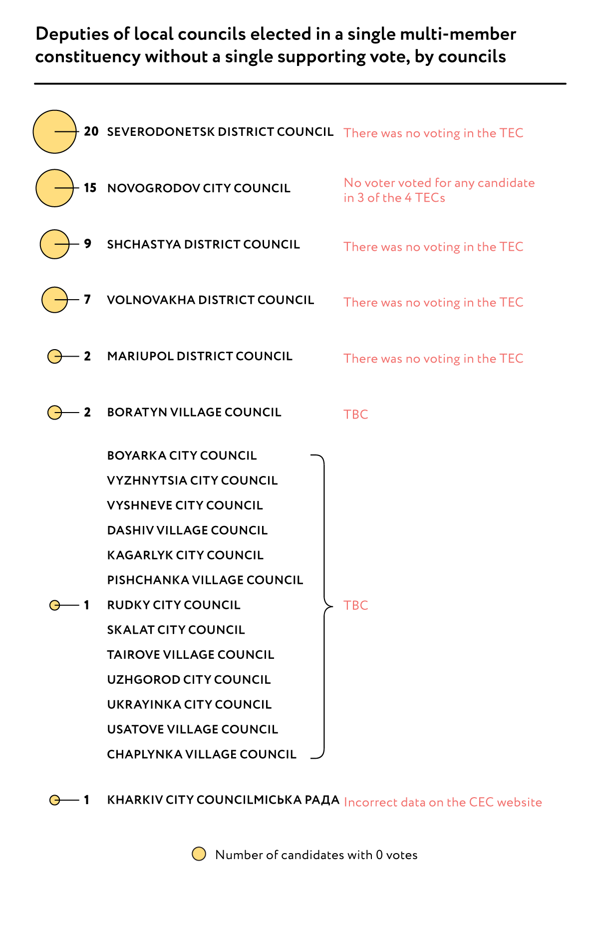 This peculiarity of the electoral system drew special attention to the numbers of local council deputies who received no or a critically small number of votes.