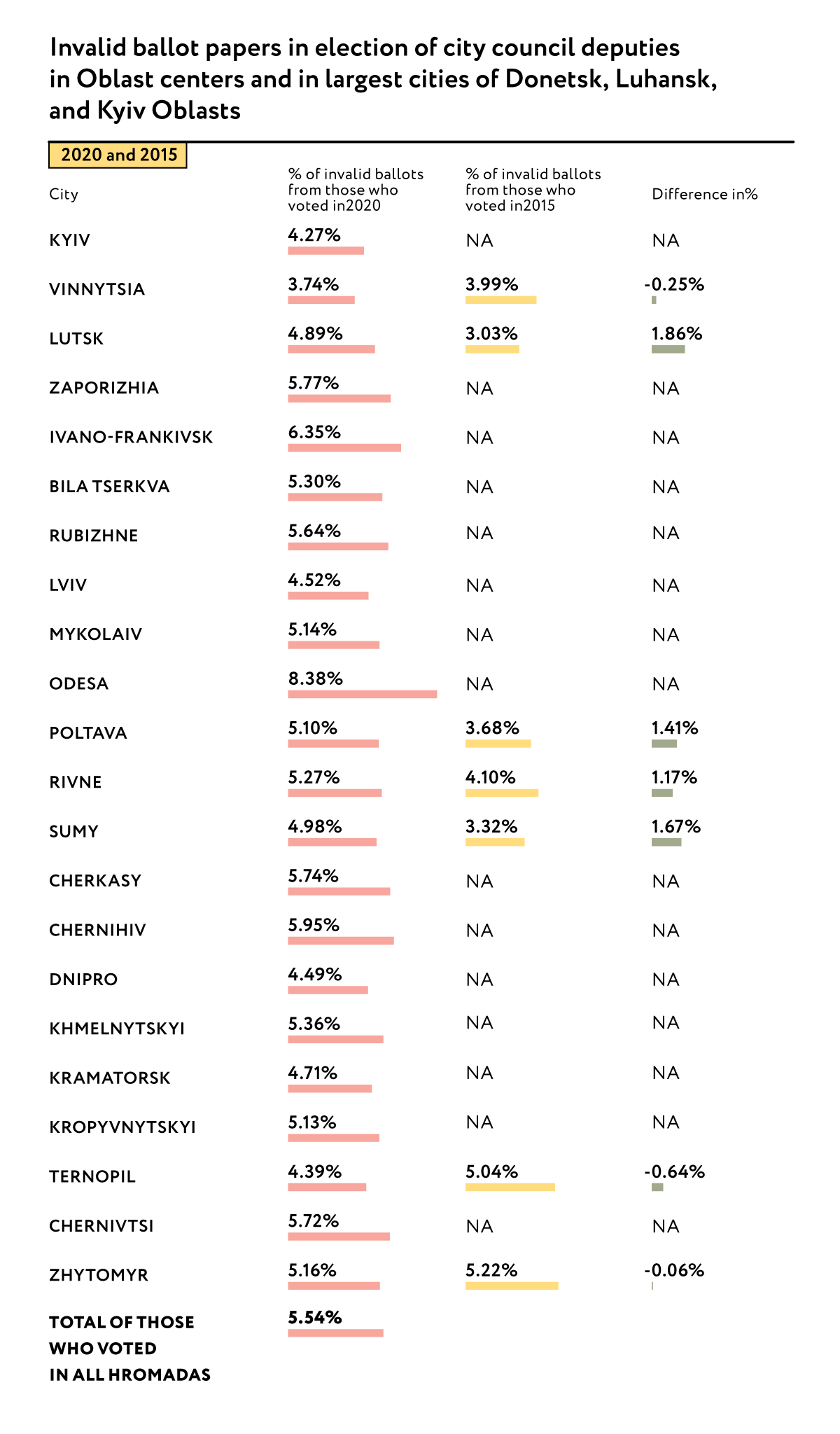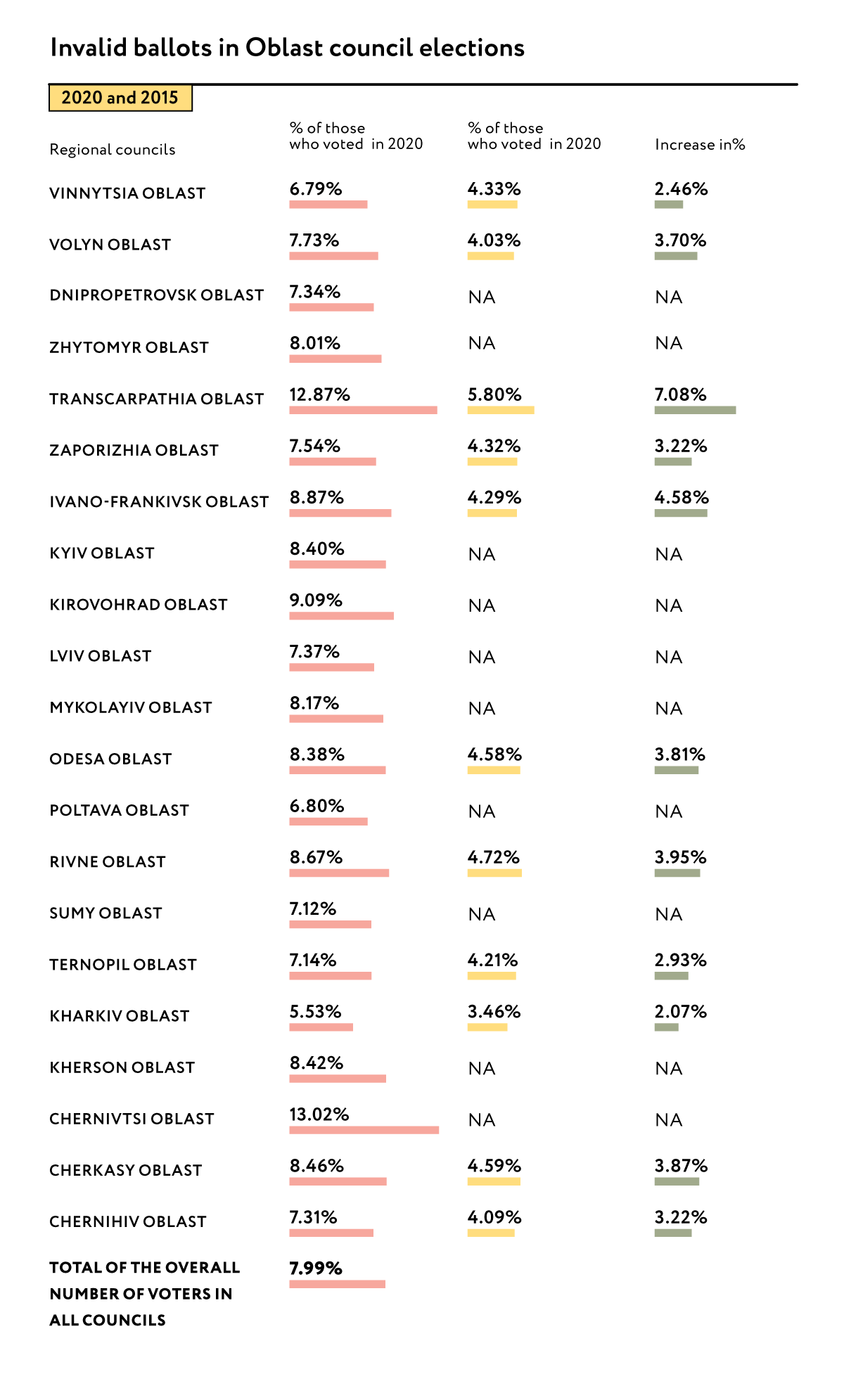 OPORA compared the numbers of invalid ballots in oblast council elections in 2015 and in 2020, in eleven oblasts (Transcarpathia, Ivano-Frankivsk, Rivne, Cherkasy, Odesa, Volyn, Zaporizhzhia, Chernihiv, Ternopil, Vinnytsia, and Kharkiv). In all oblasts for which data was available, there was an increase in the number of invalid ballots. In two oblasts (Zakarpattia and Ivano-Frankivsk) the share of invalid ballots more than doubled, in 6 oblasts – it has grown from 1.78 to 1.8 times, in three oblasts – there has been an increase from 1.59 to 1.69 times.