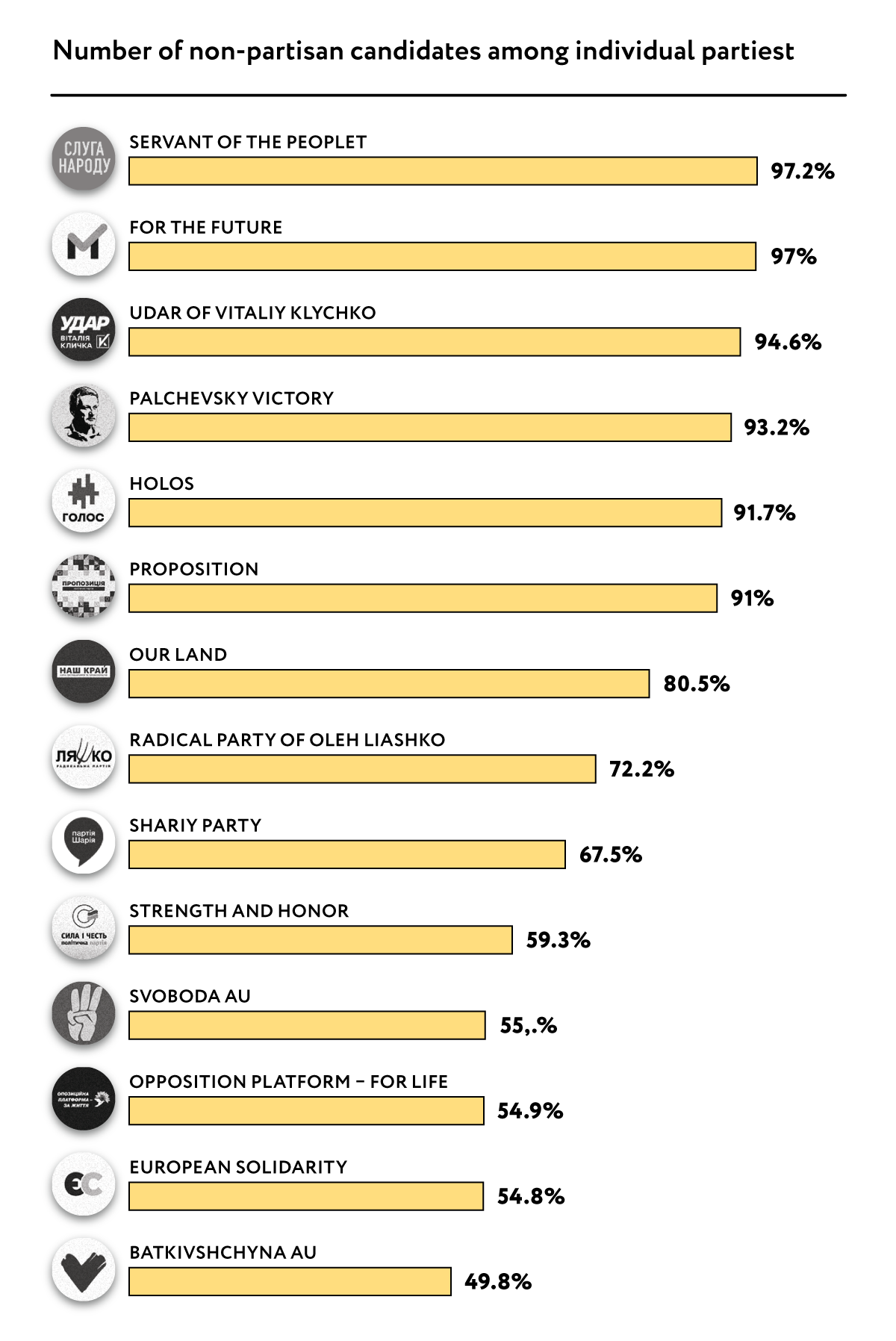 The survey included representatives of the following political parties: European Solidarity - 20 people (20.4%); Radical Party - 15 (15.3%); Holos and Batkivshchyna - 12 each (12.2%); Svoboda and Self-Reliance - 8 each (8.2%); Nash Kray (lit. - Our Land) – 4 (4,1%); Groysman Ukrainian Strategy and UKROP - 3 each (3,1%); Opposition Platform - For Life, Servant of the People, Opposition Bloc, and Syla i Chest (Strength and Honor) - 2 each (2%); Civic Position, Democratic Axe, New Politics, Volia (Will), and the Ukrainian Maritime Party of Serhiy Kivalov - 1 each (1%).