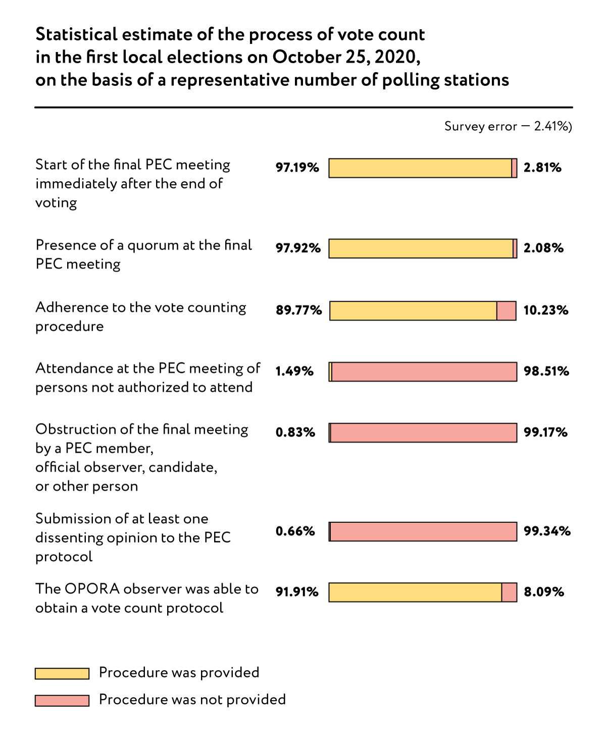 Despite previous forecasts of the risks of PEC disruptions from pandemic, final PEC meetings on 25 October 2020 almost always had quorums. OPORA observers reported a lack of a quorum in final PEC meetings at only 2.08% of polling stations. This demonstrates that TECs and PECs functioned properly, which ensured the stable functioning of election commissions responsible for counting votes.