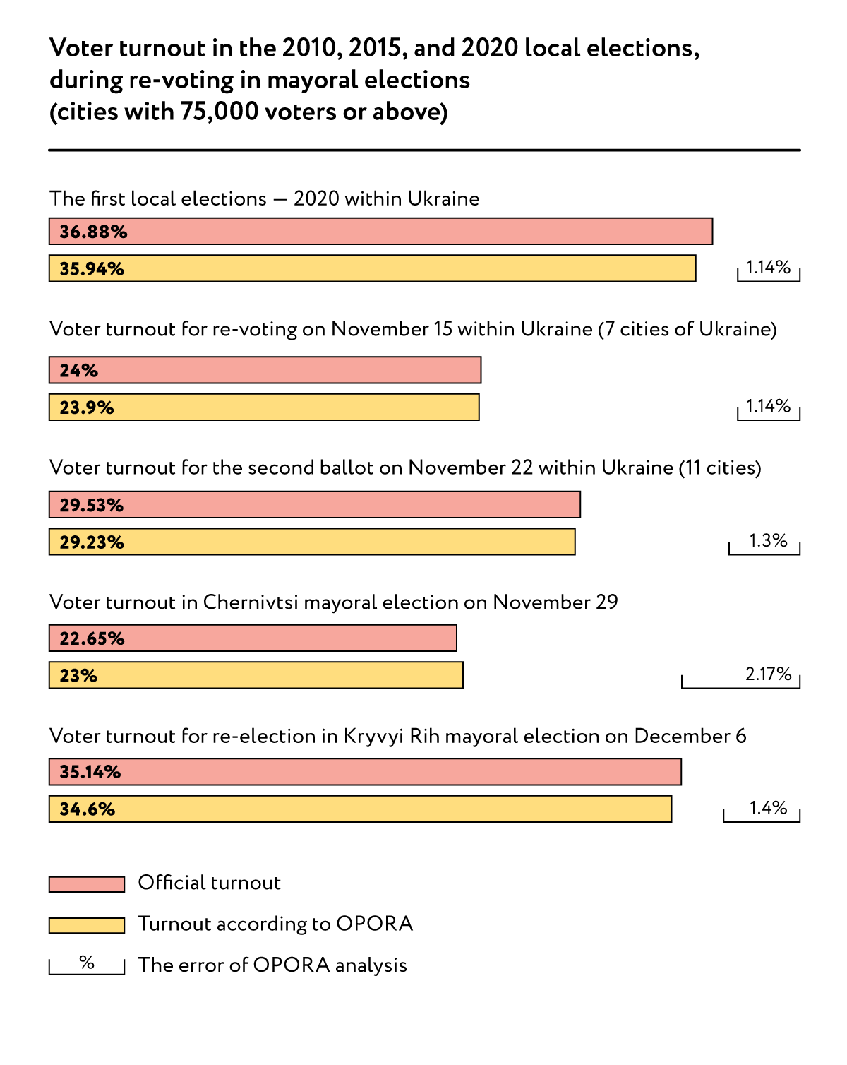 Another feature of the 2020 local campaign in 2020 was the lack of a single date for the second round of mayoral elections. The date of the second round was decided by the TEC within the period required by law (or in some cases outside the period when there was lengthy litigation over results). As with the October 25, 2020 vote, OPORA observers counted turnout at polling stations in re-voting cities. Our data allowed us to compare indicators of voter activity on different voting dates (accounting for the features of our methodology).