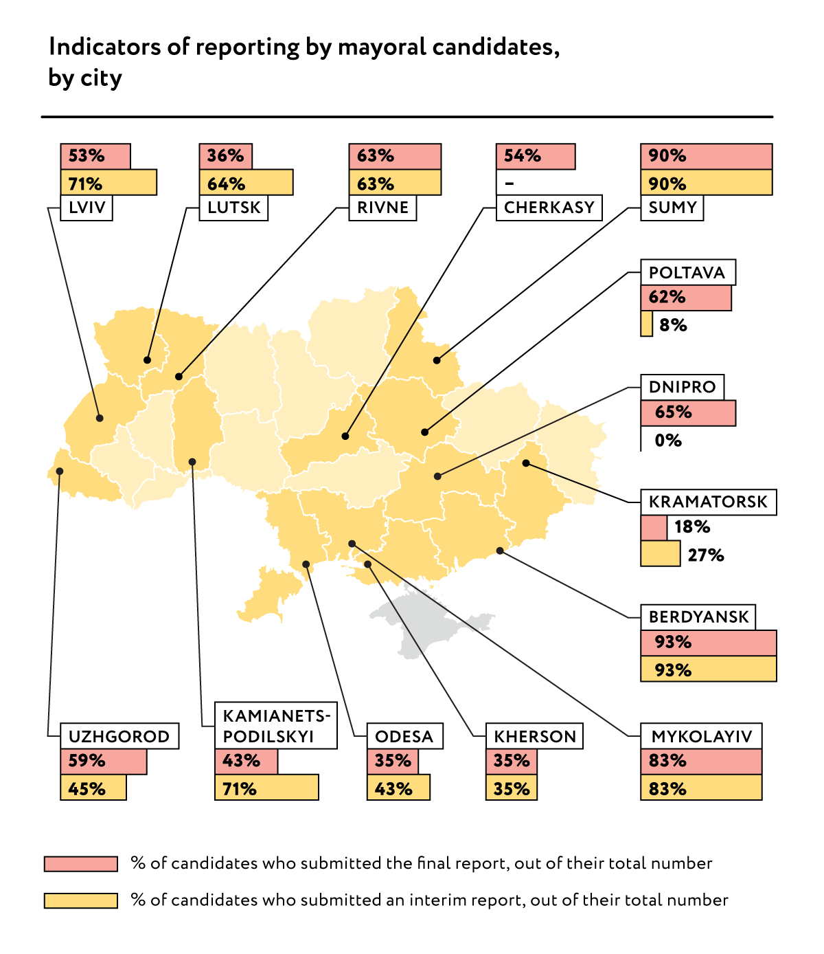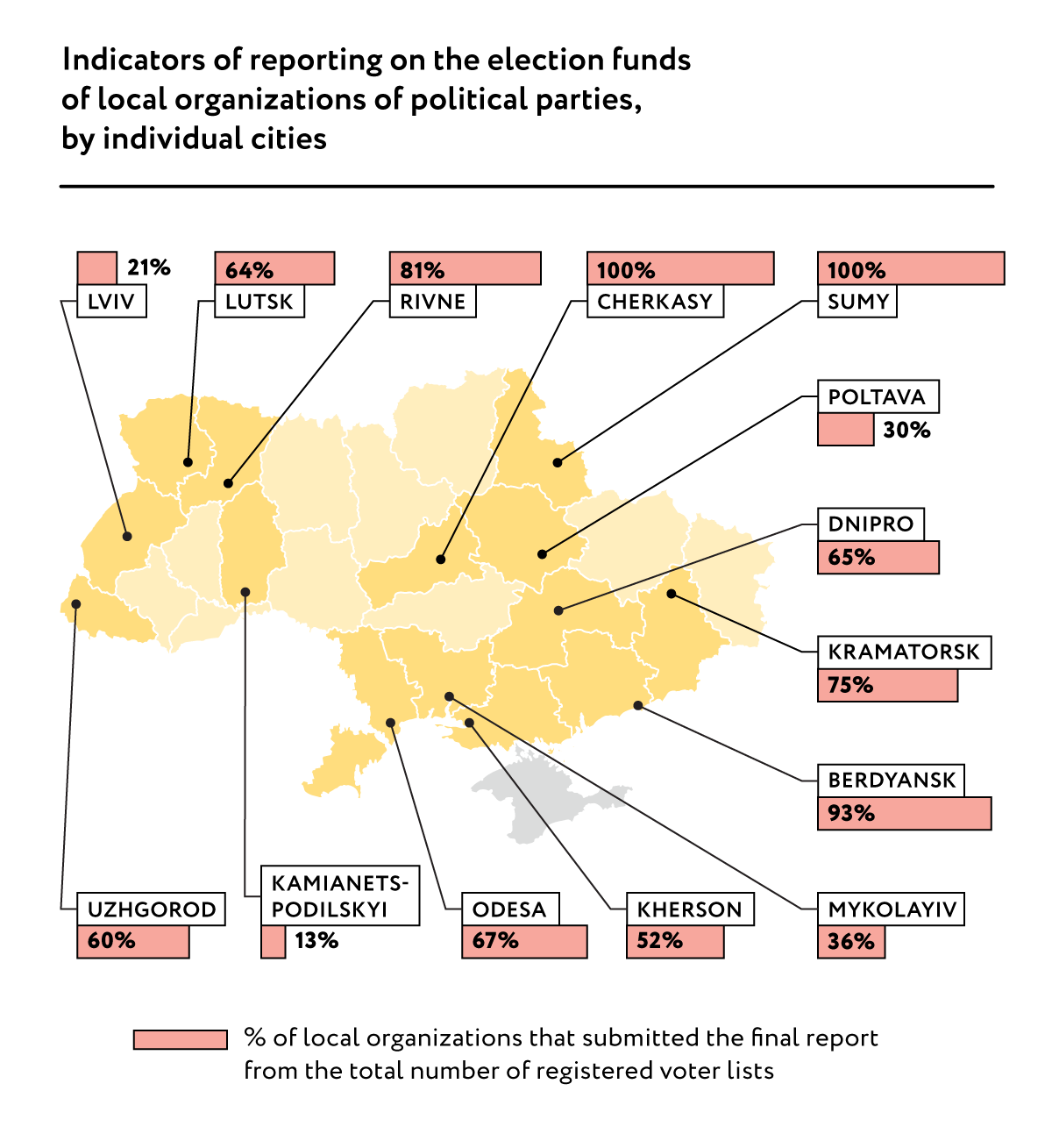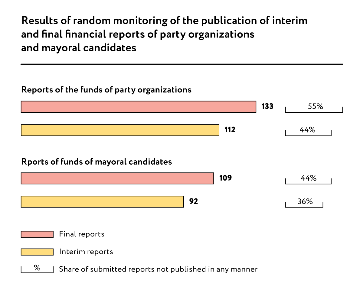 Our observers found that the state of affairs in ensuring the transparency and accountability of election finances during the 2020 local elections was extremely unsatisfactory and requires decisive steps from the government. Voters de facto did not have access to candidates' interim and final financial statements, while assessments of their compliance were usually pro forma at best and often not conducted at all. After the conclusion of the campaign, the public had virtually no access to data on the expenditures of candidates or party organizations. In order for Ukrainian legislation to fully comply with the recommendations of GRECO, the Council of Europe’s anti-corruption monitoring body, Ukraine needs to significantly strengthen campaign finance disclosure requirements, as well as the institutional capacity of the National Agency for the Prevention of Corruption (NAPC) as an election campaign finance monitoring and enforcement body. Another important step would be the introduction of an online mechanism for the immediate disclosure of all contributions and expenditures for all candidates and political parties, which would allow the public to effectively compare declared and actual expenditures.