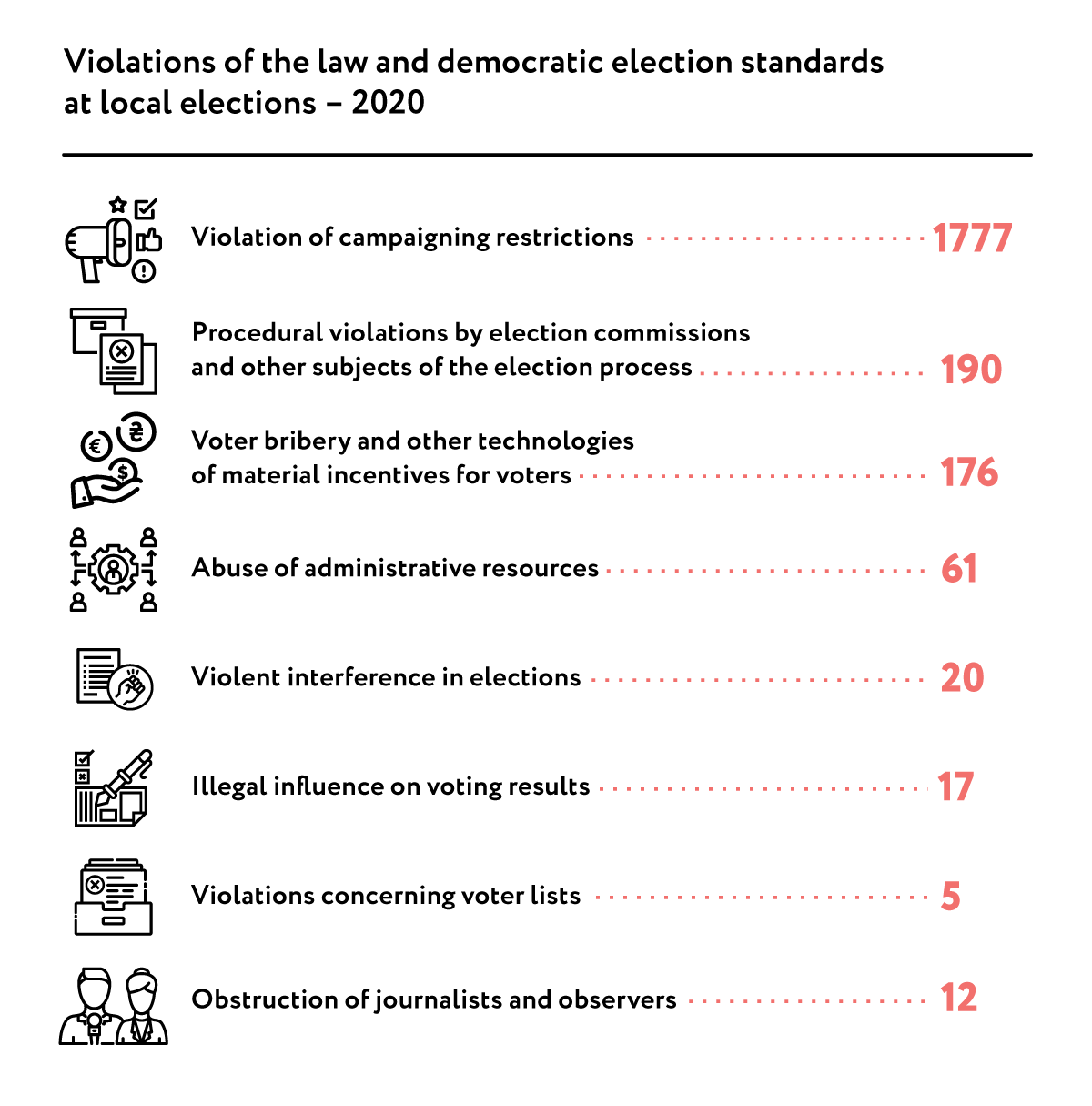 The 2020 local elections were held in unprecedented conditions associated with the spread of COVID-19. The specifics of anti-pandemic measures during the election process were not at all regulated by election legislation, but were established using by-laws. Prior to the election process, we called upon the parliament to regulate the framework requirements for elections under pandemic conditions through changes to the Electoral Code, which would facilitate the effective implementation of anti-pandemic measures by the state, local governments, and election administrators. Legislative regulation of the specifics of holding elections during a pandemic would also have boosted the public legitimacy of the measures taken. Unfortunately, the necessary legislative changes were not adopted, which had a negative impact on the administration of the election process.