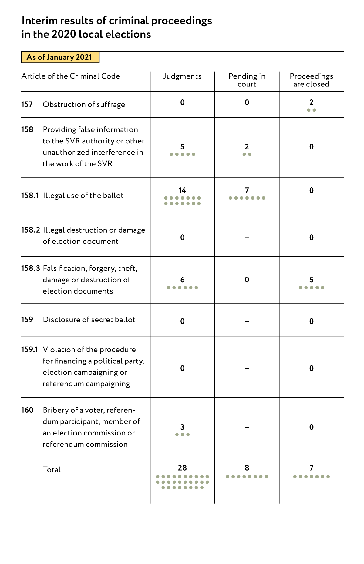 - Conduct and publish a comprehensive analysis of the results of the investigation of election-related crimes in local elections, as well as of the advantages and disadvantages of the amended Criminal Code and Code of Administrative Offenses.