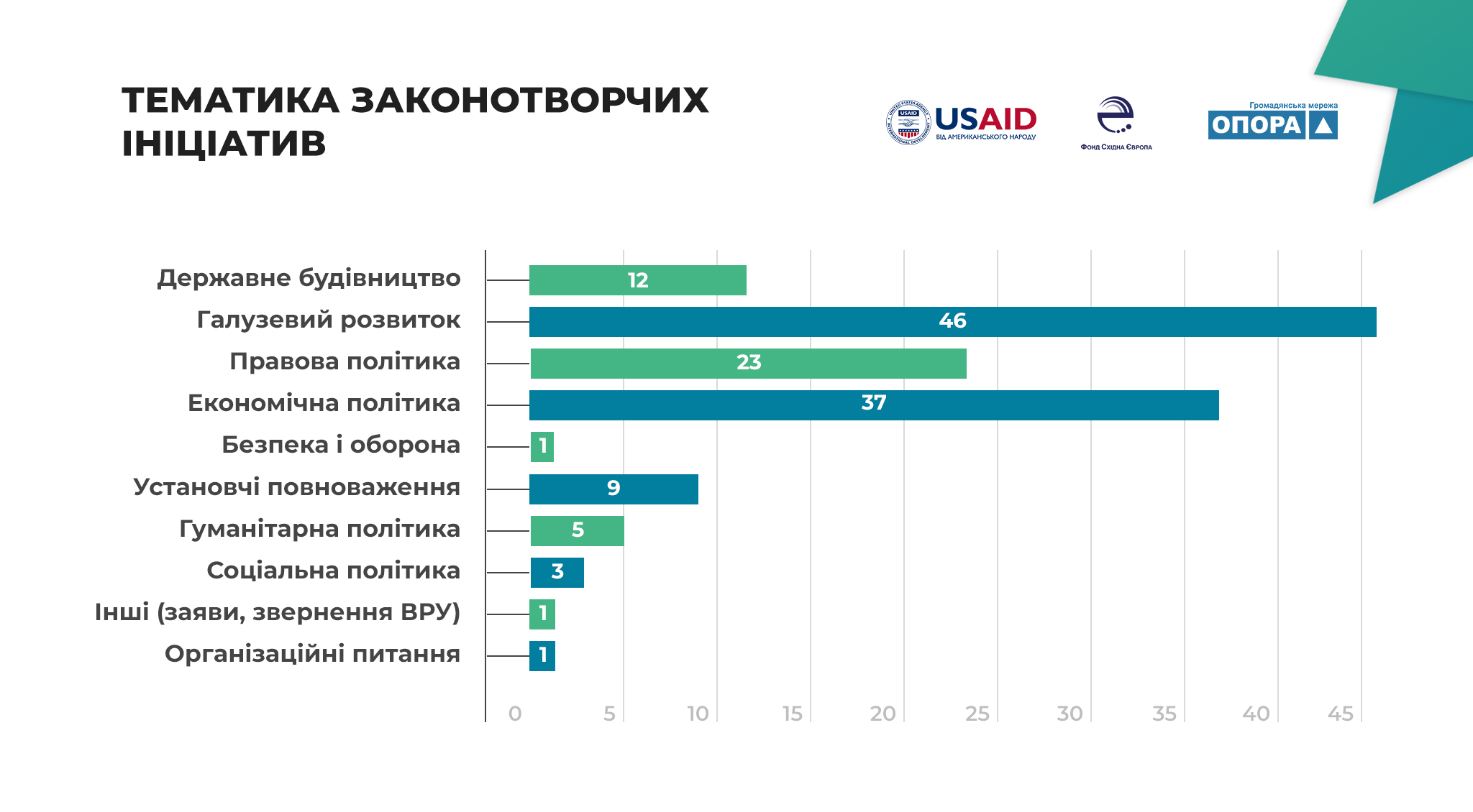 Найбільше уваги у законотворчій діяльності івано-франківські парламентарі надавали проблематиці галузевому розвитку (33%), економічній політиці (27%) і правовій політиці (16,5%). Пріоритетними, наприклад, для Оксани Савчук стали законотворчі ініціативи, що стосуються економічної політики, галузевого розвитку і державного будівництва. Для Ігоря Фріса пріоритетними були правова політика, галузевий розвиток і економічна політика, для Едуарда Прощука – галузевий розвиток, економічна політика. Олександр Матусевич, Зіновій Андрійович і Володимир Тимофійчук під час законотворення акцентували увагу на галузевий розвиток і економічну політику. У зв’язку з невеликою кількістю законотворчих ініціатив у Андрія Іванчука (6 проєктів закону) важко виділи пріоритетні для нього тематики законотворення.
