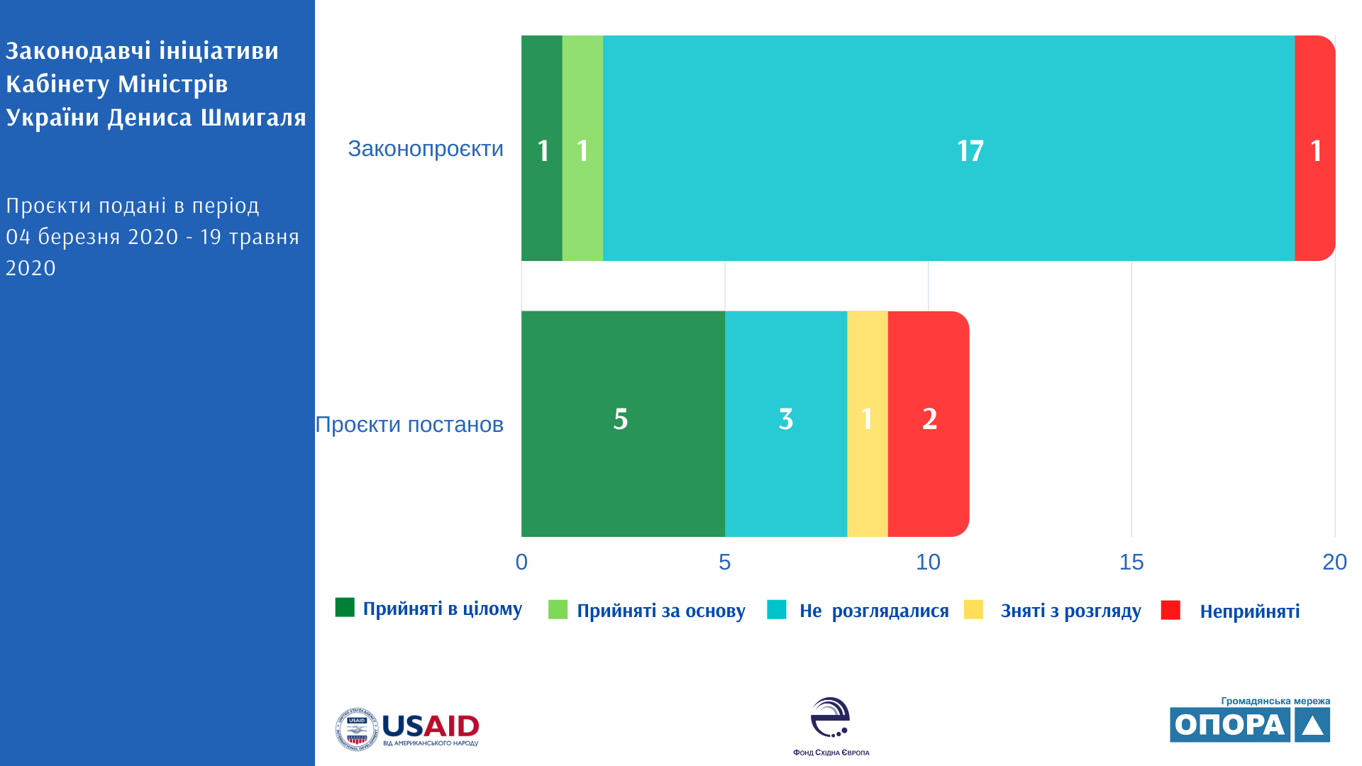 Кабінет Міністрів України Дениса Шмигаля в перші 2,5 місяці роботи продемонстрував значно нижчий рівень залученості у законотворчий процес, ніж попередній Уряд, як з точки зору ініціювання змін до законодавства, так і з точки зору результативності у вигляді прийнятих актів. Так, лише один законопроєкт, прийнятий в цілому та один – за основу з 20 поданих актів, свідчать про те, що урядові ініціативи не є пріоритетними для Верховної Ради України. Значна кількість ініційованих документів (8 з 3, або 26%) складають кадрові призначення.