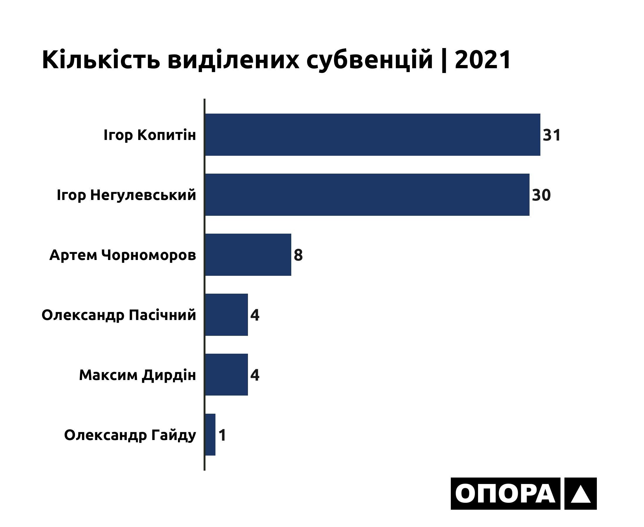Із шести мажоритарних округів Миколаївської області порівну коштів було направлено на п'ять округів, вони отримали по 10 млн грн. Ще 9,9 млн грн спрямовано на 131-ий округ. Так, найбільше субвенцій, а саме 31, отримав 129-ий округ народного депутата Ігоря Копитіна. На 130-ий округ нардепа Ігоря Негулевського спрямовано 30 субвенцій. На 131-ий округ Артема Чорноморова направлено вісім субвенцій. У той же час 127-ий округ народних депутатів Олександра Пасічного та 132-ий округ Максима Дирдіна отримали по чотири субвенції. Лише одну субвенцію було направлено на 128-ий округ Олександра Гайду.
