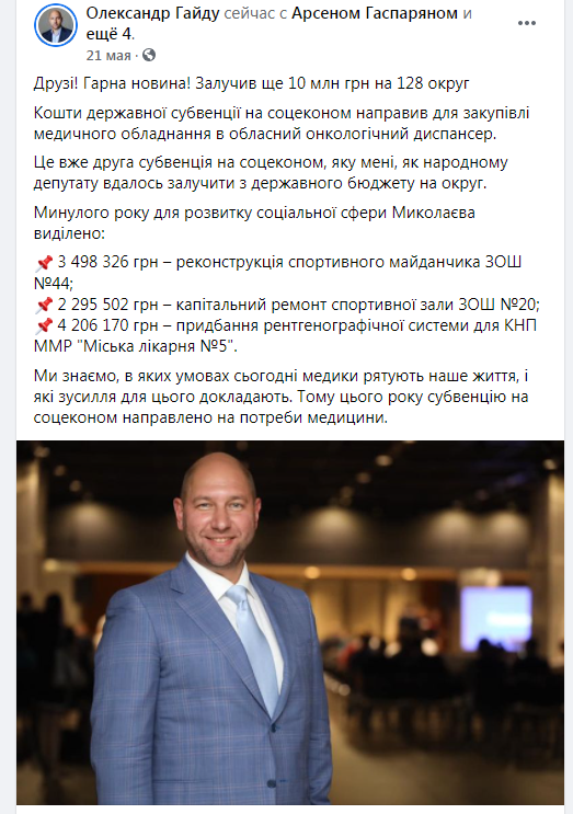 Народний депутат Олександр Гайду 21 травня написав на своїй офіційній сторінці в Facebook, що йому вдалося залучити на 128-ий округ ще 10 млн грн коштів державної субвенції. Вони спрямовані на закупівлю медичного обладнання в Миколаївський обласний онкологічний диспансер.