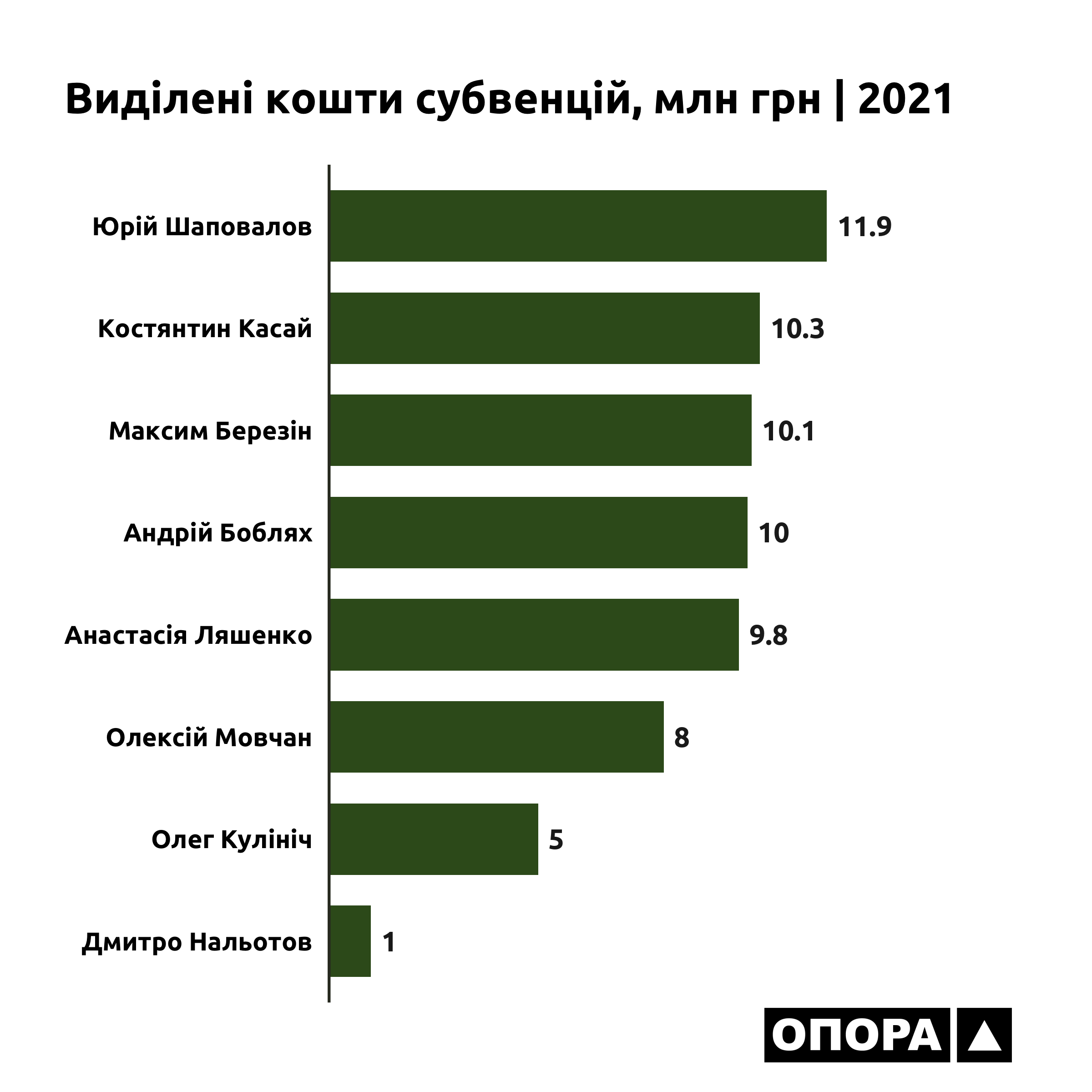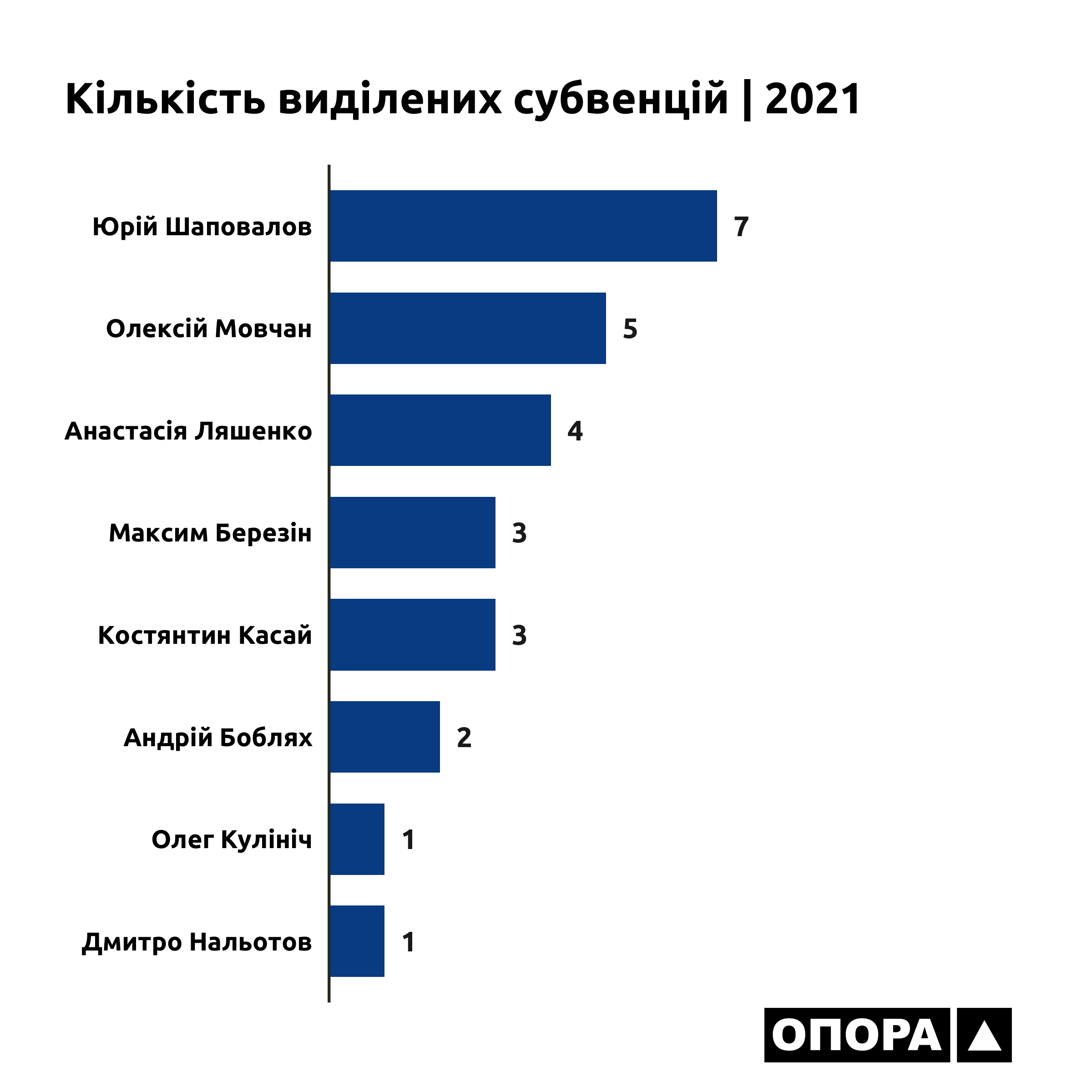 За кількістю субвенцій найбільше отримали округи Юрія Шаповалова (7 субвенцій), Олексія Мовчана (5 субвенцій) та Анастасії Ляшенко (4 субвенції).