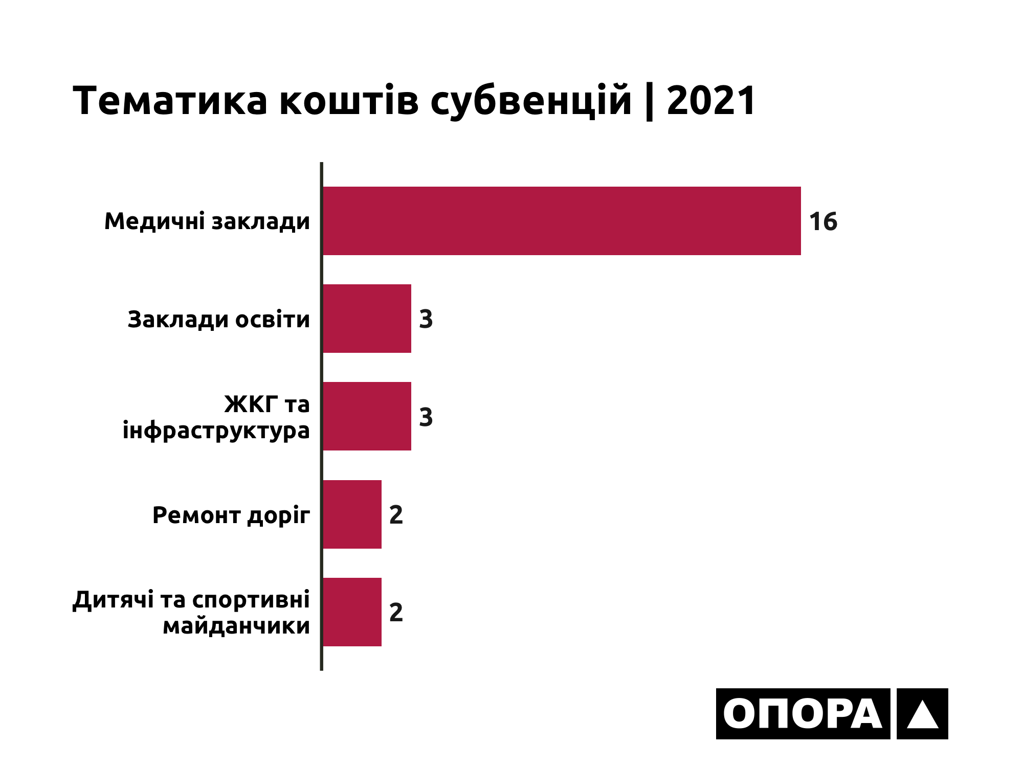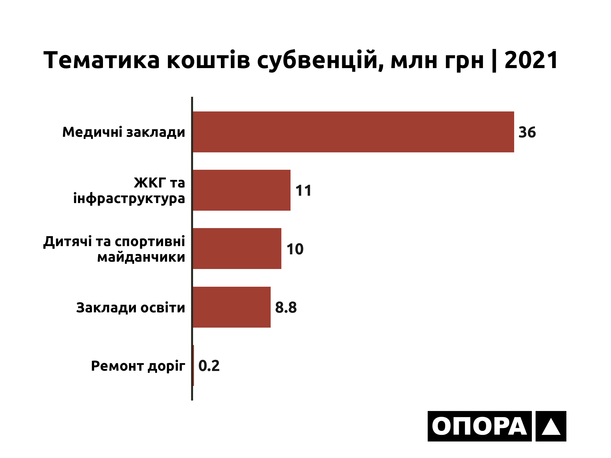 Понад половина коштів виділено на 16 субвенцій для медичних закладів (36 мільйонів або 54,5% всіх субвенцій області). На об’єкти ЖКГ та інфраструктури передбачено 11 мільйонів гривень, а на дитячі та спортивні майданчики – 10 мільйонів гривень.